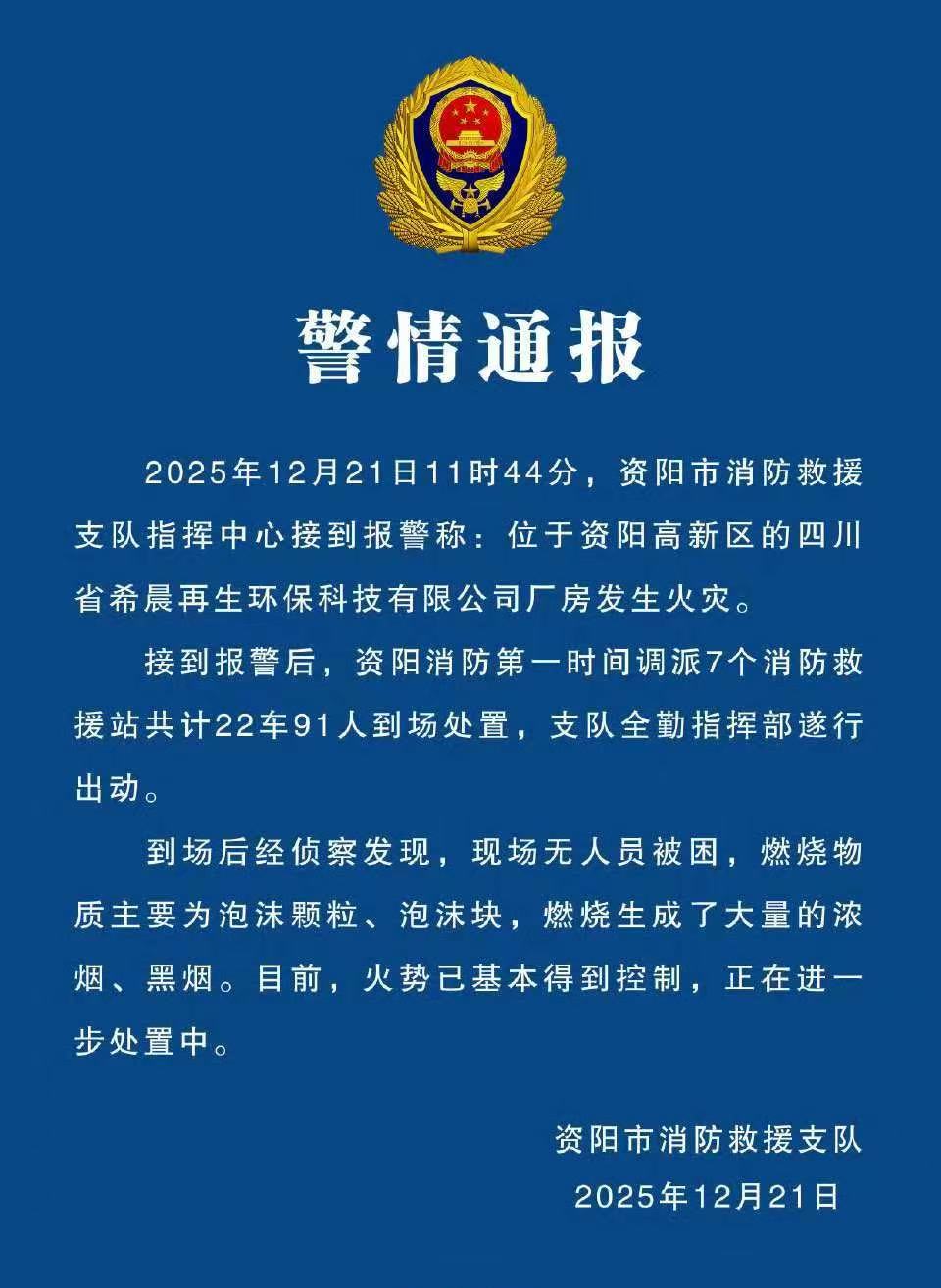 12月21日,有网友发布视频称,四川资阳高新区有厂房发生火灾,现场火势较大,浓烟滚滚。当天14时30分许,资阳市消防救援支队发布警情通报称,燃烧物质主要为泡沫,现场无人员被困。