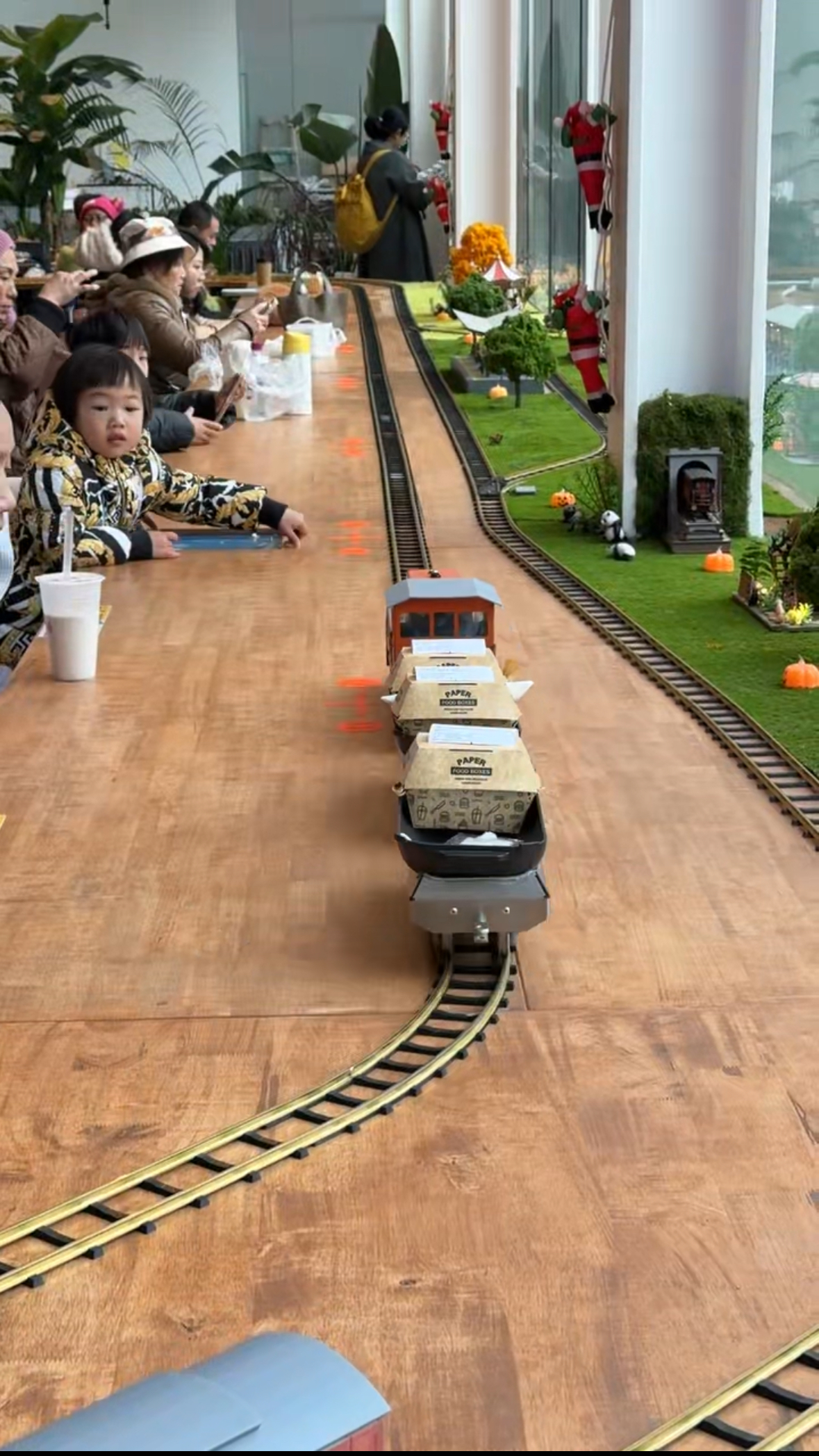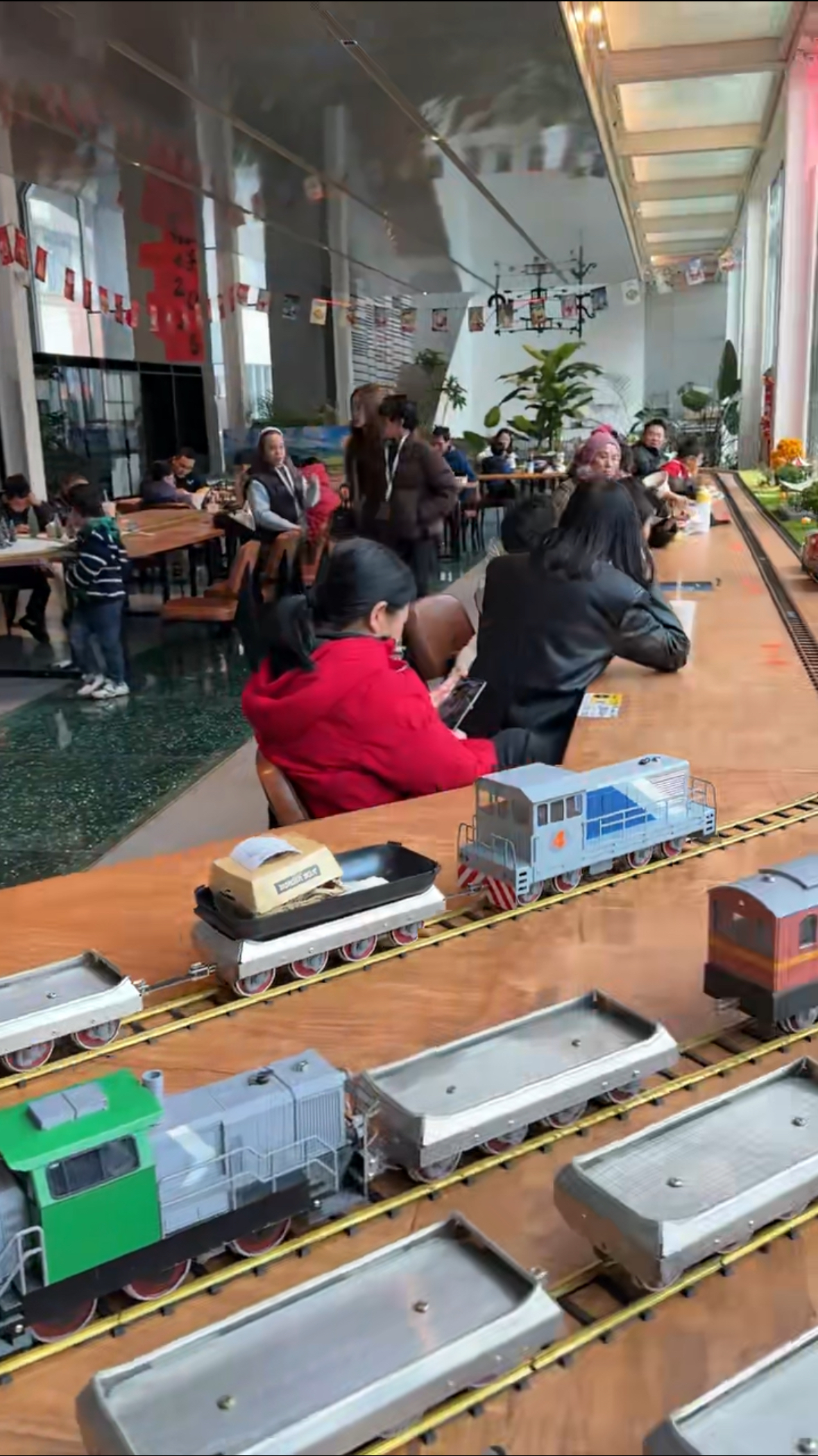 记者在现场探访发现,火车餐厅打造了“轨道沙盘送餐”的沉浸式体验:小火车沿着轨道将餐食送至顾客桌前,让用餐过程变成一场趣味互动。