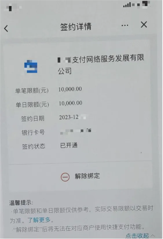 对接专业理赔客服后,对方指导张女士进行录屏操作,让张女士绑定需要收款的账户,并完善相关信息包括建立收款密码、卡号、开户行、预留电话、身份信息等,并让张女士提供绑卡过程中收到的验证码。在“专业理赔客服”的指导下,整个过程完成得非常快。张女士本以为完成账户绑定完成后就可以马上收到退票钱和延误险的钱,然而等来的却是自己银行卡账户的扣款10000元的短信。