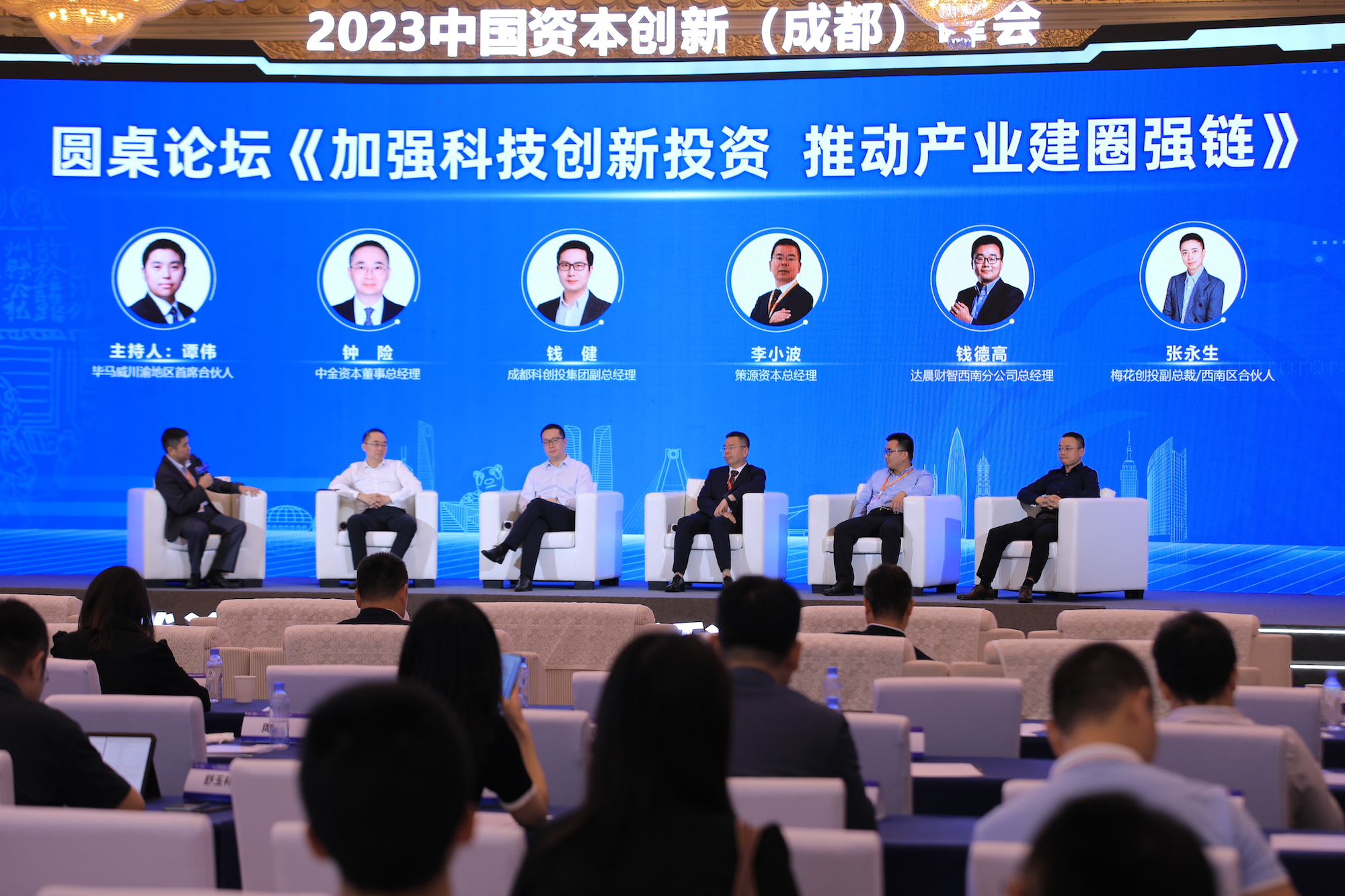 圆桌对话环节聚焦“加强科技创新投资 推动产业建圈强链”主题,在毕马威川渝地区首席合伙人谭伟的主持下,中金资本董事总经理钟险、策源资本总经理李小波、成都科创投集团副总经理钱健、达晨财智西南分公司总经理钱德高、梅花创投副总裁及西南区合伙人张永生等知名创投机构代表积极为成都发展献计献策。