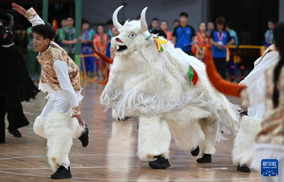 新华社三亚11月25日电(记者郑直 张泽伟 刘博)音乐响起,身着藏式服装的孩子们与身披毛毡、扮演牦牛的孩子们冲进场内,或跳起热情奔放的舞蹈,或模仿着牦牛的动作与形态,时而奔腾,时而对峙,饱含力量的动作与呐喊呈现着来自雪域高原的勇猛与坚韧,展现人与自然和谐共处的生动景象,也让体育馆内每一位观众都能感受到他们对民族传统体育文化的热爱与自豪。