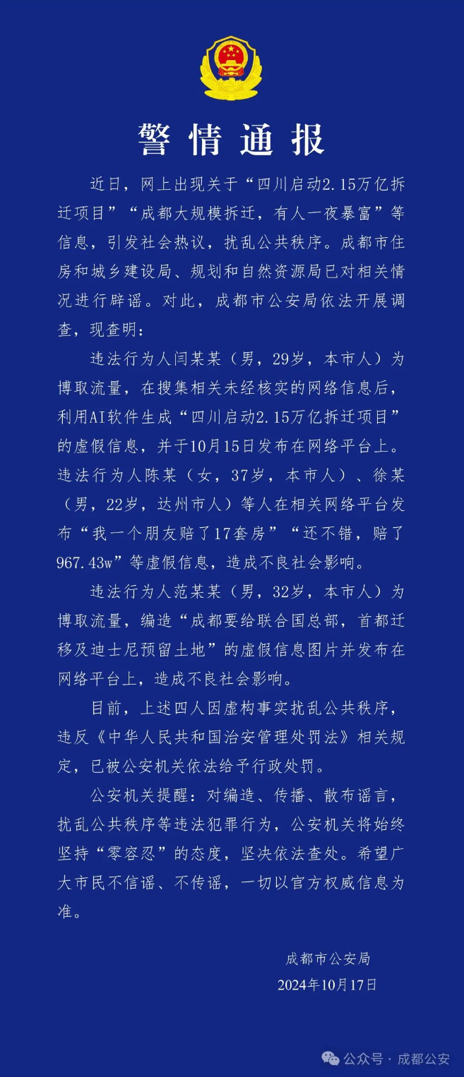 近日,网上出现关于“四川启动2.15万亿拆迁项目”“成都大规模拆迁,有人一夜暴富”等信息,引发社会热议,扰乱公共秩序。成都市住房和城乡建设局、规划和自然资源局已对相关情况进行辟谣。对此,成都市公安局依法开展调查,现查明: