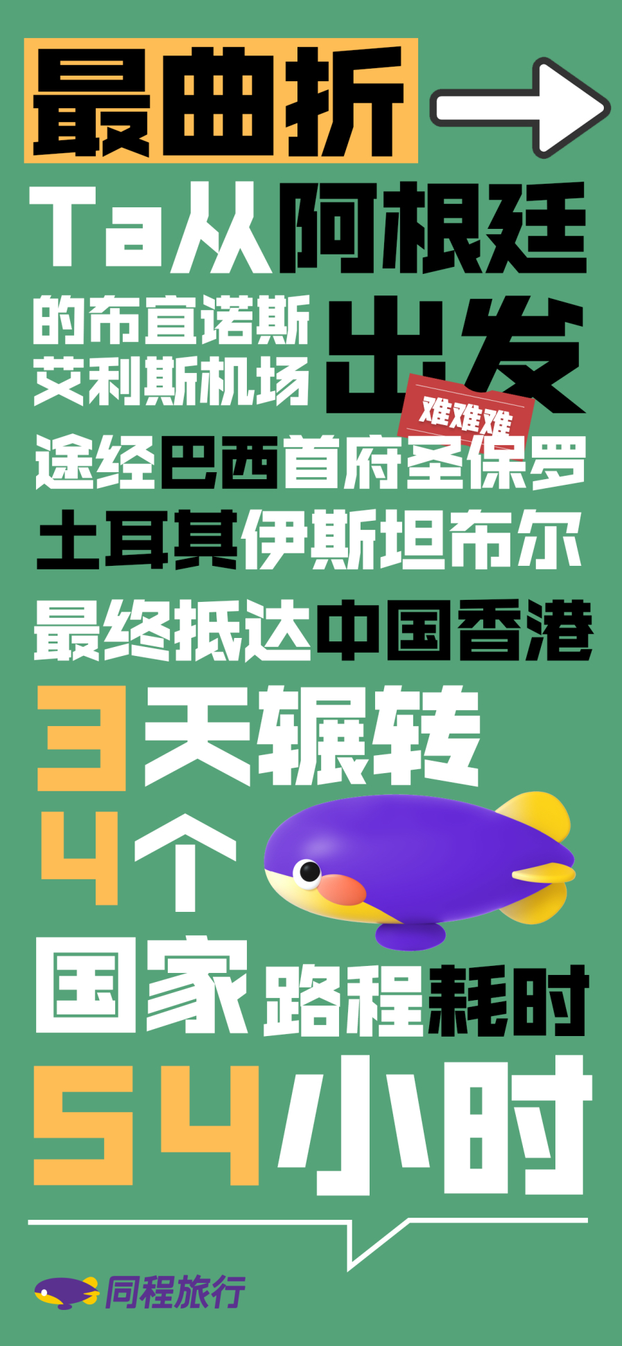 平台上,一位用户从阿根廷布宜诺斯艾利斯出发,途径巴西首府圣保罗和土耳其的伊斯坦布尔,最终抵达中国香港。在3天之内耗时54小时辗转4个国家,堪称春运期间最曲折的返乡路程。
