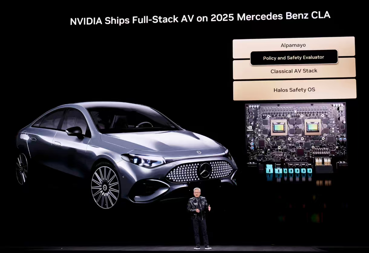 在CES现场,搭载英伟达技术的梅赛德斯-奔驰 CLA 车型,演示了由人工智能定义的驾驶功能。英伟达还首次披露,计划最早于2027年与合作伙伴测试其自主参与的无人驾驶出租车服务,车辆将达到L4级自动驾驶水平,可在限定区域内实现无需人工干预行驶。