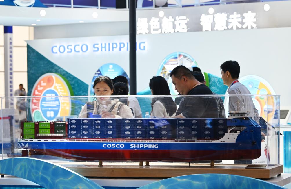 7月11日,与会者在博览会上参观电动集装箱船的模型。新华社记者 李然 摄