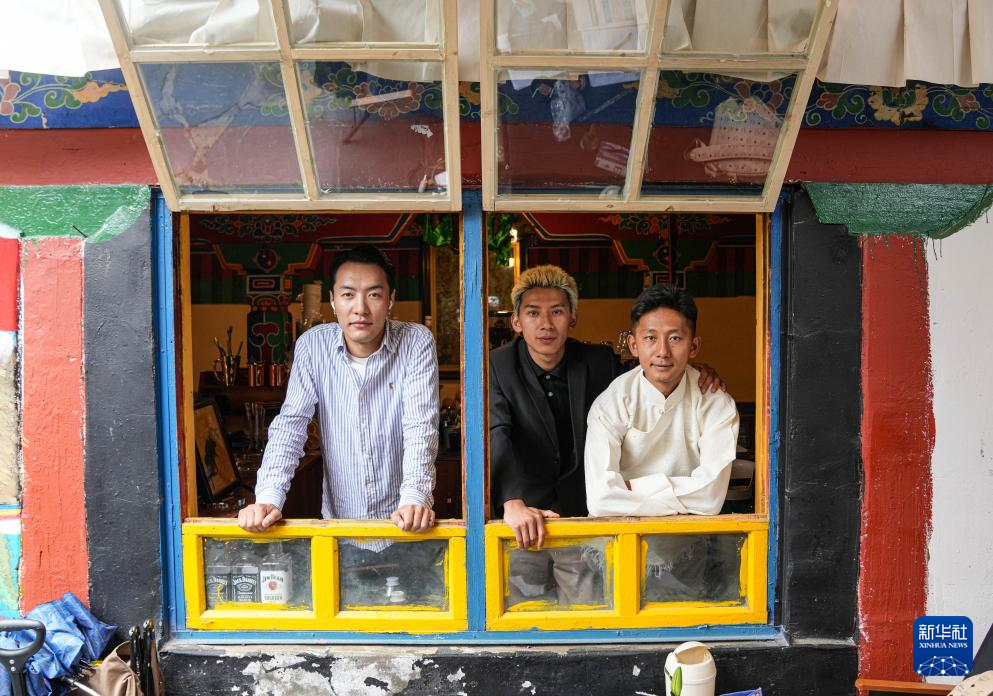 咖啡店三名年轻合伙人旦增特觉(右)、旦增格桑(中)和扎西多吉合影(7月5日摄)。新华社记者 晋美多吉 摄