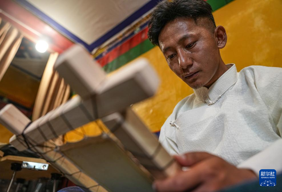 旦增特觉在店内绘画(7月5日摄)。他曾是一名唐卡画师。新华社记者 晋美多吉 摄