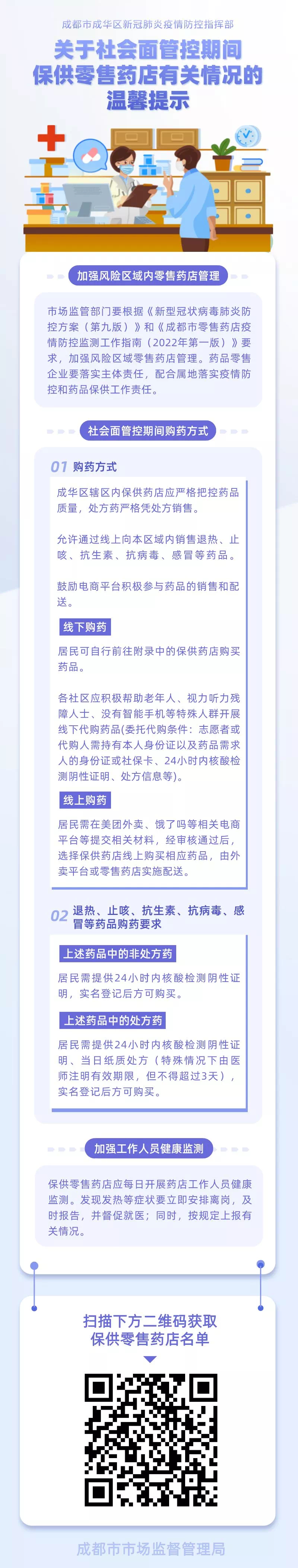 记者从成都市市场监管局了解到,成华区实施社会面管控期间区域内保供零售药店名单已公布,市民可在这204家保供药店购药,也可线上购药。