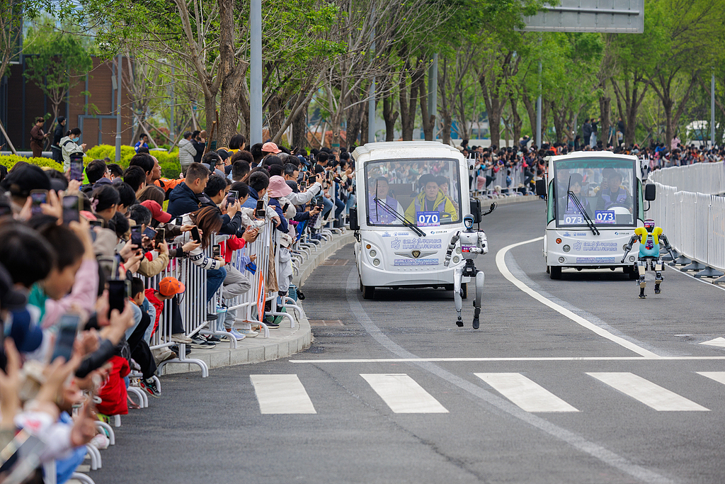 2026年4月19日,北京亦庄人形机器人半程马拉松赛场上,两台机器人“你追我赶”。视觉中国 图
