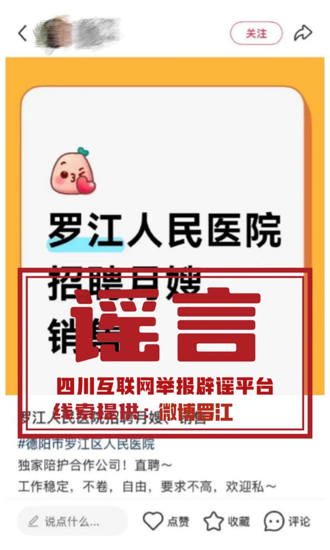 谣言:网传德阳罗江人民医院招聘月嫂、销售?