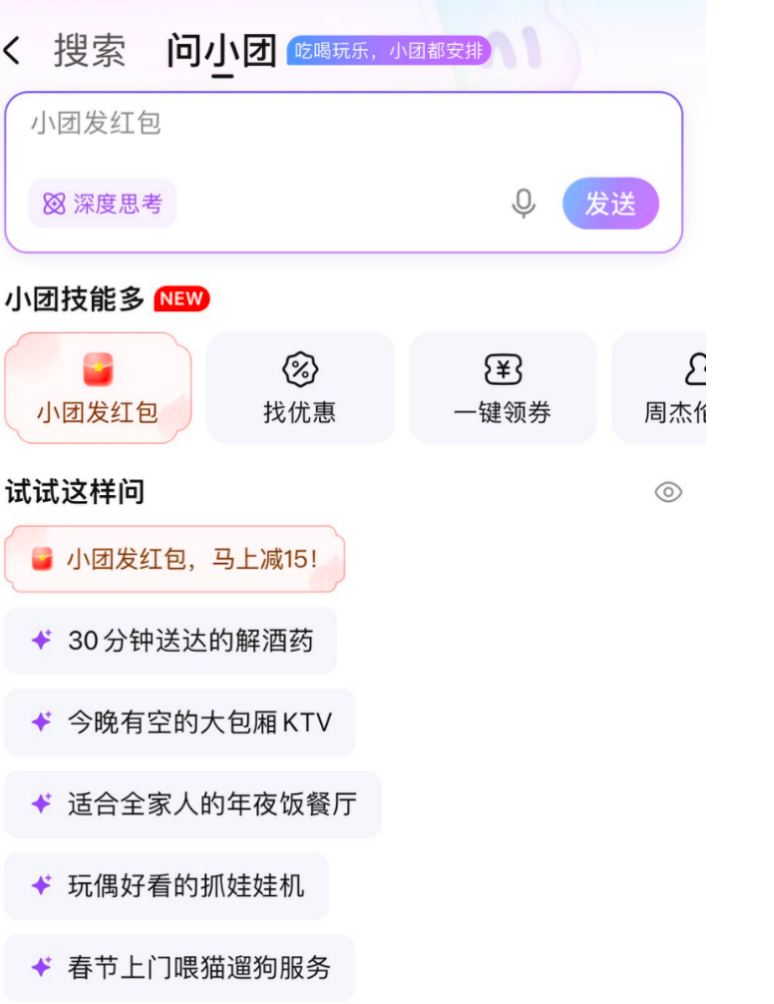 2月12日,美团升级“问小团”AI管家。即日起,至春节假期结束,用户在App使用该工具,提出本地吃喝玩乐相关问题,“问小团”可以进行深度思考,搜集平台上准确及时的商户与服务信息,并进行二次校验,结合真实用户评价,提供精准匹配需求且可交易的选择。同时,用户进入“问小团”春节专区,还可领取春节消费券。