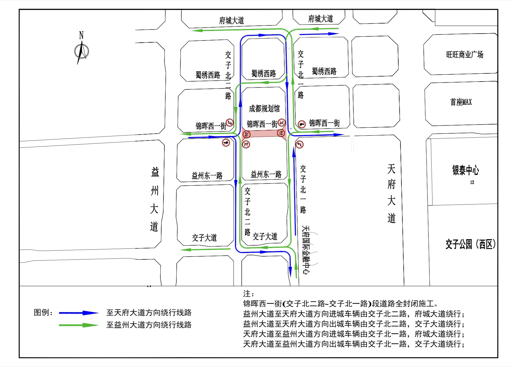 施工期间,受限车辆通过交子北一路、府城大道、交子大道等道路绕行。