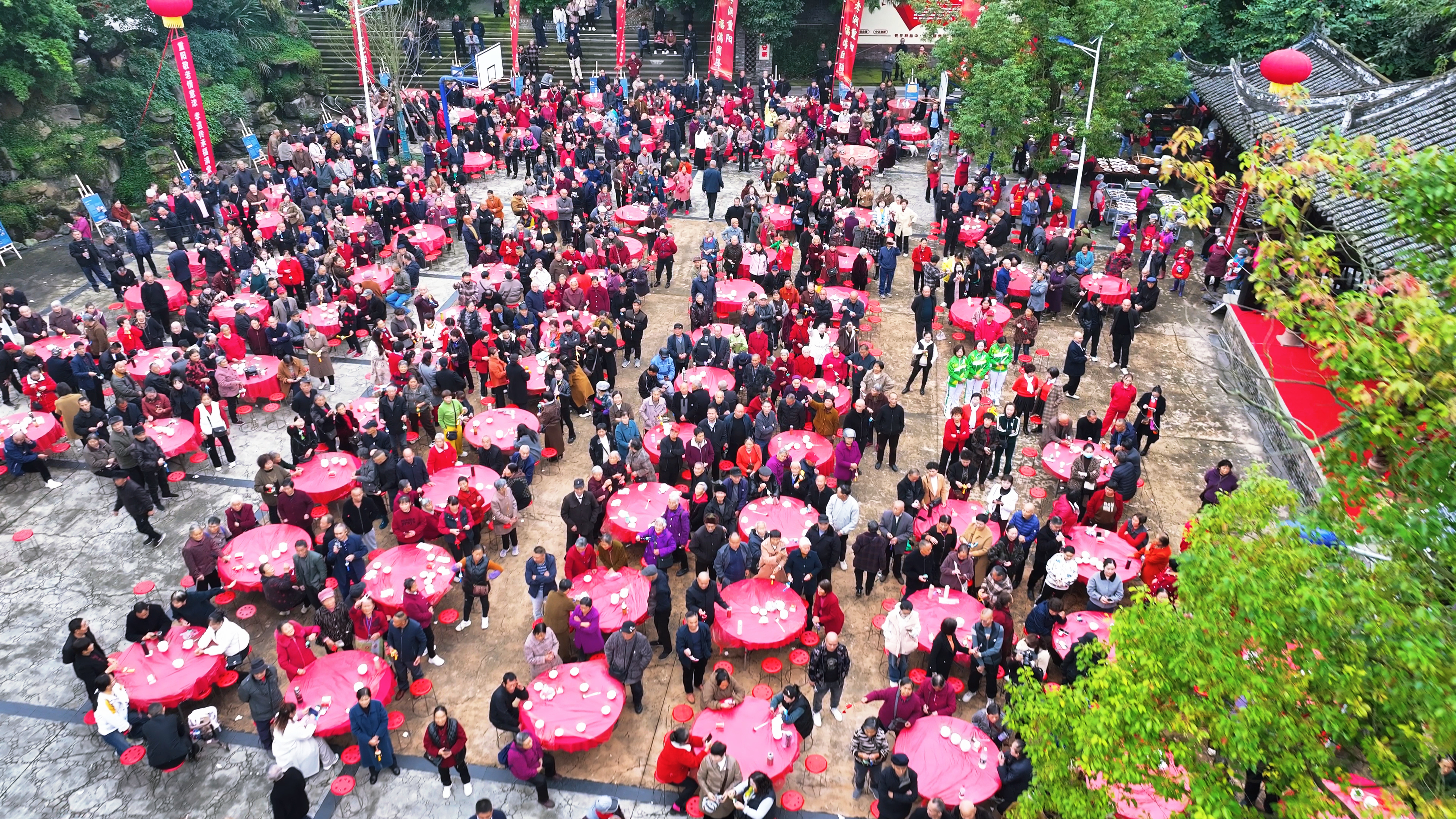 仪式结束后,情谊满满的百余桌坝坝宴热闹开席,村民们围坐一堂,在欢声笑语中共品佳肴,共享团圆,将孝亲敬老的家庭温情与邻里和睦的社区氛围推向顶点。