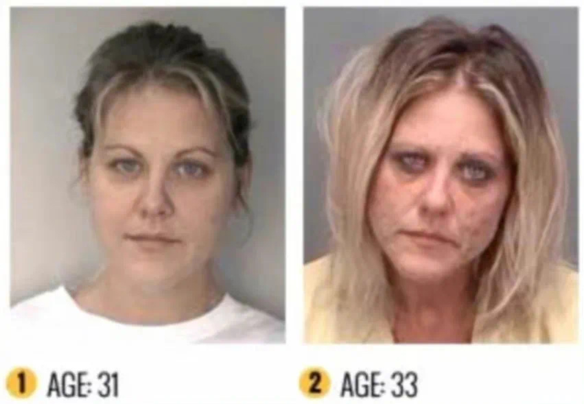 此外,皮肤溃烂和牙齿脱落也是长期吸毒者外貌常见变化。还有不少吸毒者在长期吸食毒品后,造成营养不良,导致眉毛和肌肉下垂,眼眶凹陷,面部大面积变形。