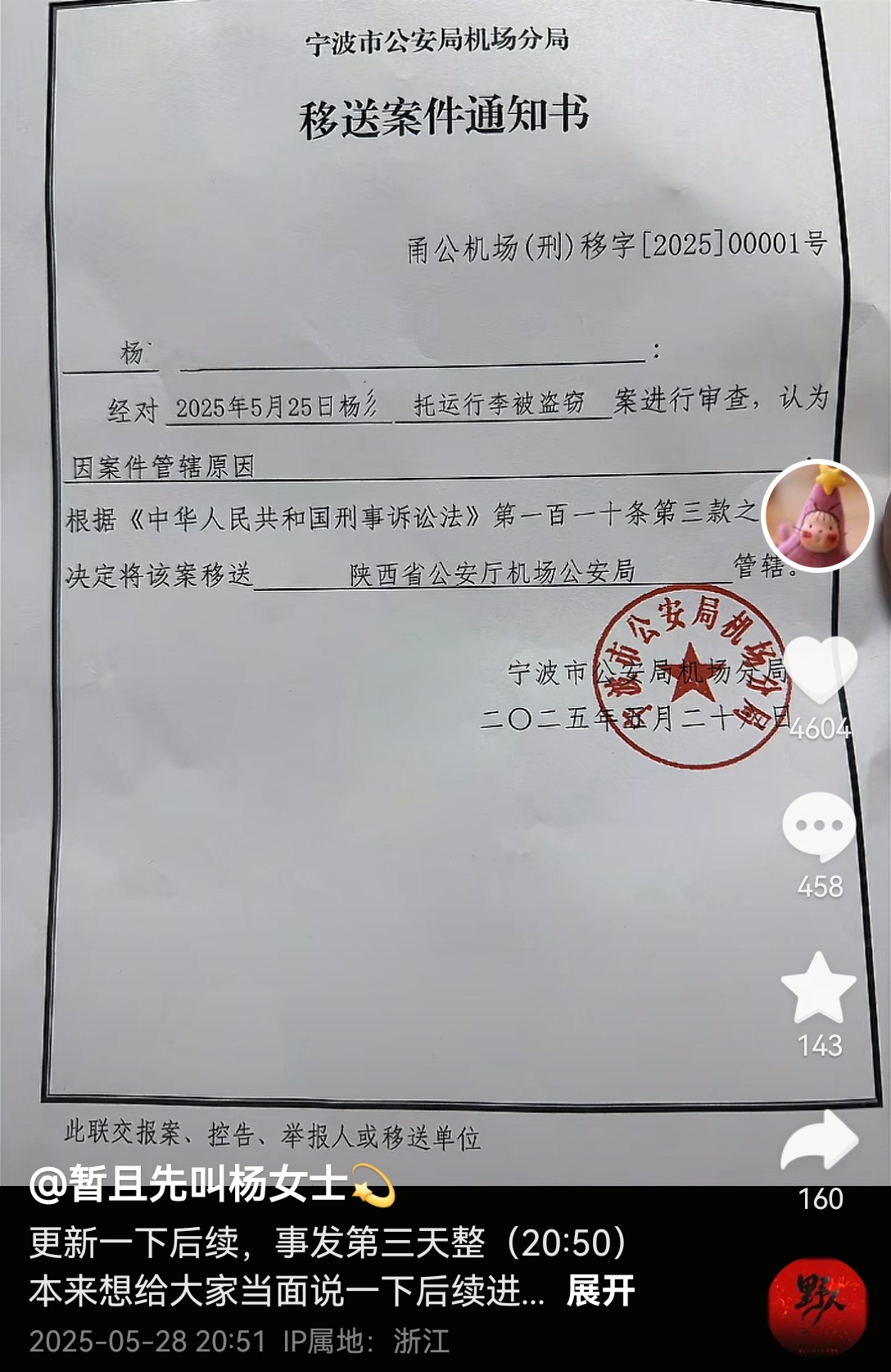 29日,杨女士直播中介绍,宁波警方调查确认行李箱在落地宁波后无异常,将案件移交给了咸阳机场公安,“咸阳机场公安已经刑事拘留一名嫌疑人,还涉及到其他案件。但尚不清楚他是航空公司的人还是机场的人,手链也暂时还没找回。”