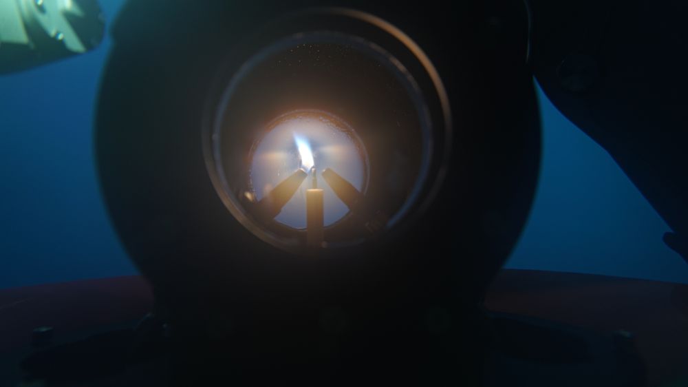 ↑9月18日,采火装置在海底成功引燃“源火”。新华社发(广州海洋地质调查局供图)