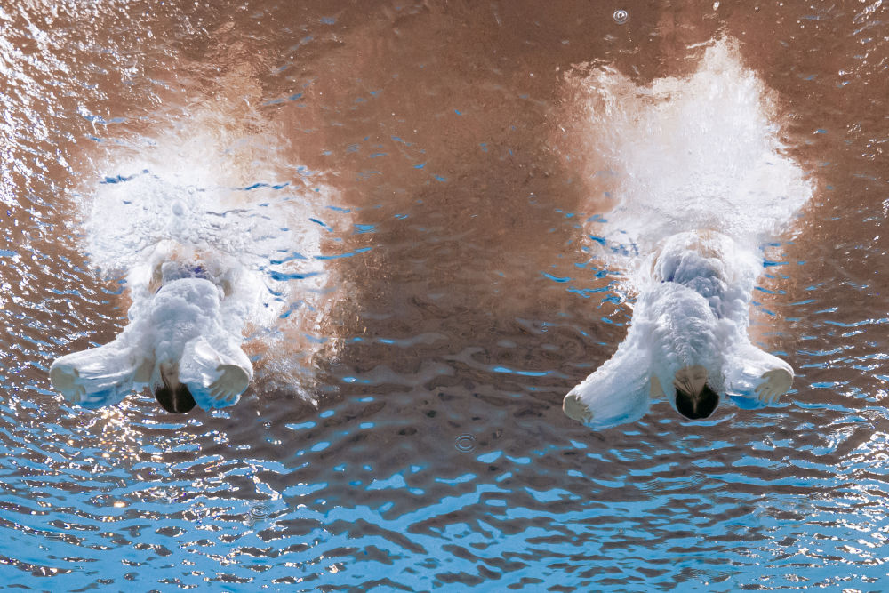 ↑11月2日,广东队组合全红婵/王伟莹在跳水女子团体赛双人10米跳台项目比赛中。新华社记者 夏一方 摄