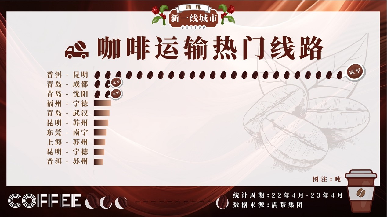 此外,作为一座因啤酒而知名的城市,如今的青岛却因为“美酒加咖啡”而引得“游人醉”。以山东为代表的华东地区是我国咖啡加工企业集聚分布区域,从海外进口的咖啡豆往往要经青岛到烟台加工后才能运往各大消费城市,故咖啡运输热门线路中,以青岛为出发地的线路上榜3条。