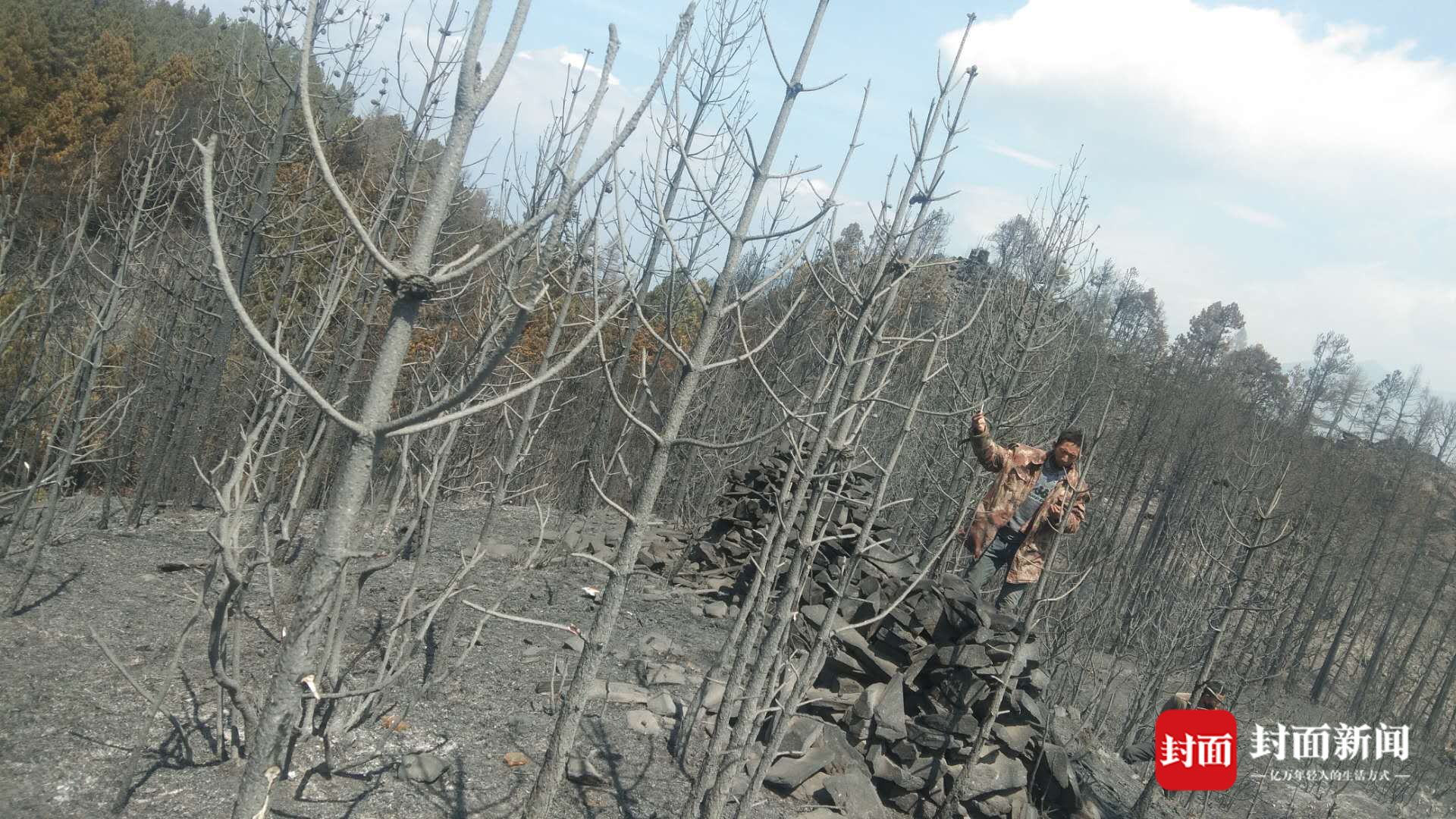 4月3日,当地参与救火工作的村民阿金(化名),用照片,向封面新闻记者展示了火灾现场的情况。在他提供的照片中,火灾现场树木全被烧焦满目黑灰色。