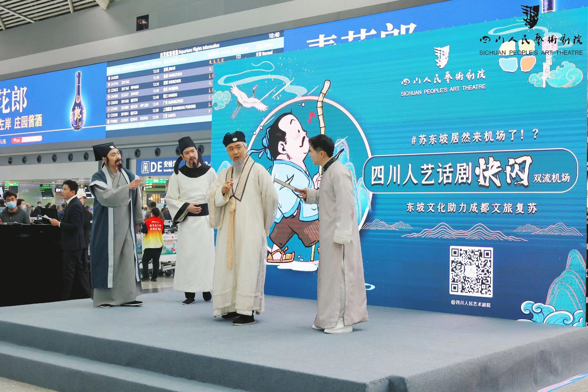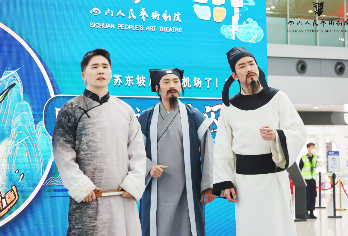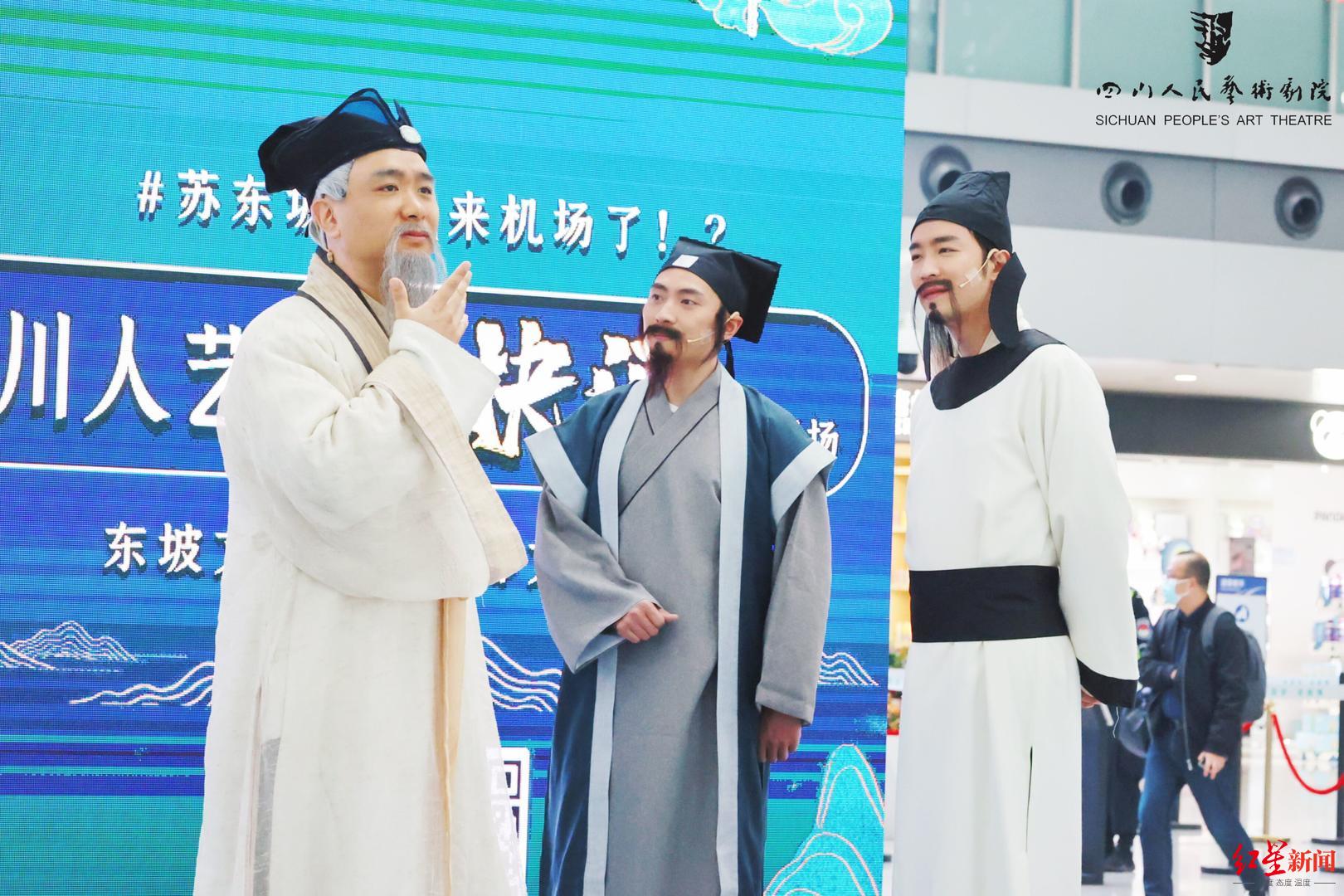 3月7日,四川人艺话剧《苏东坡》快闪活动亮相成都双流国际机场,引发现场众多旅客关注。