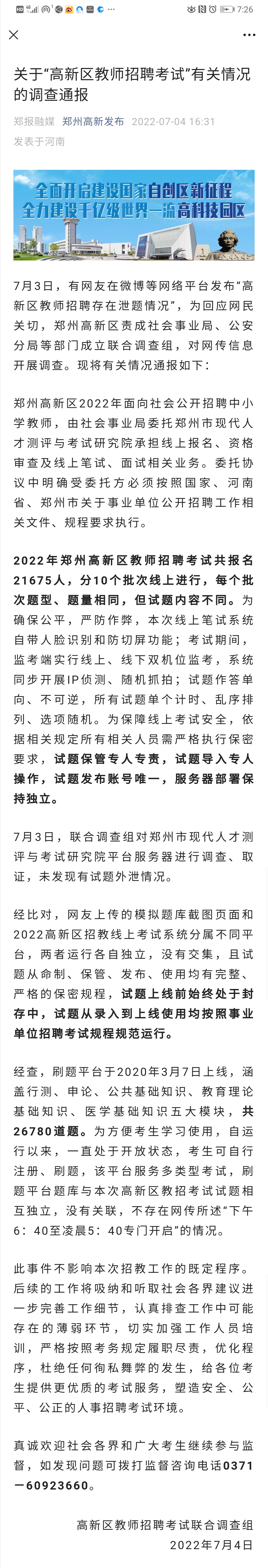 7月3日,参加河南郑州高新区中小学教师考试的考生在微博上发布“高新区教师招聘存在泄题情况”,话题一度冲上热搜。高新区责成社会事业局、公安分局等部门成立联合调查组,对网传信息展开调查。7月4日下午4点半,“郑州高新发布”微信公众号发布了调查结果。