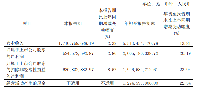 单看第三季度,迎驾贡酒实现营收17.11亿元,同比增长2.32%;归母净利润6.25亿元,同比增长2.86%。