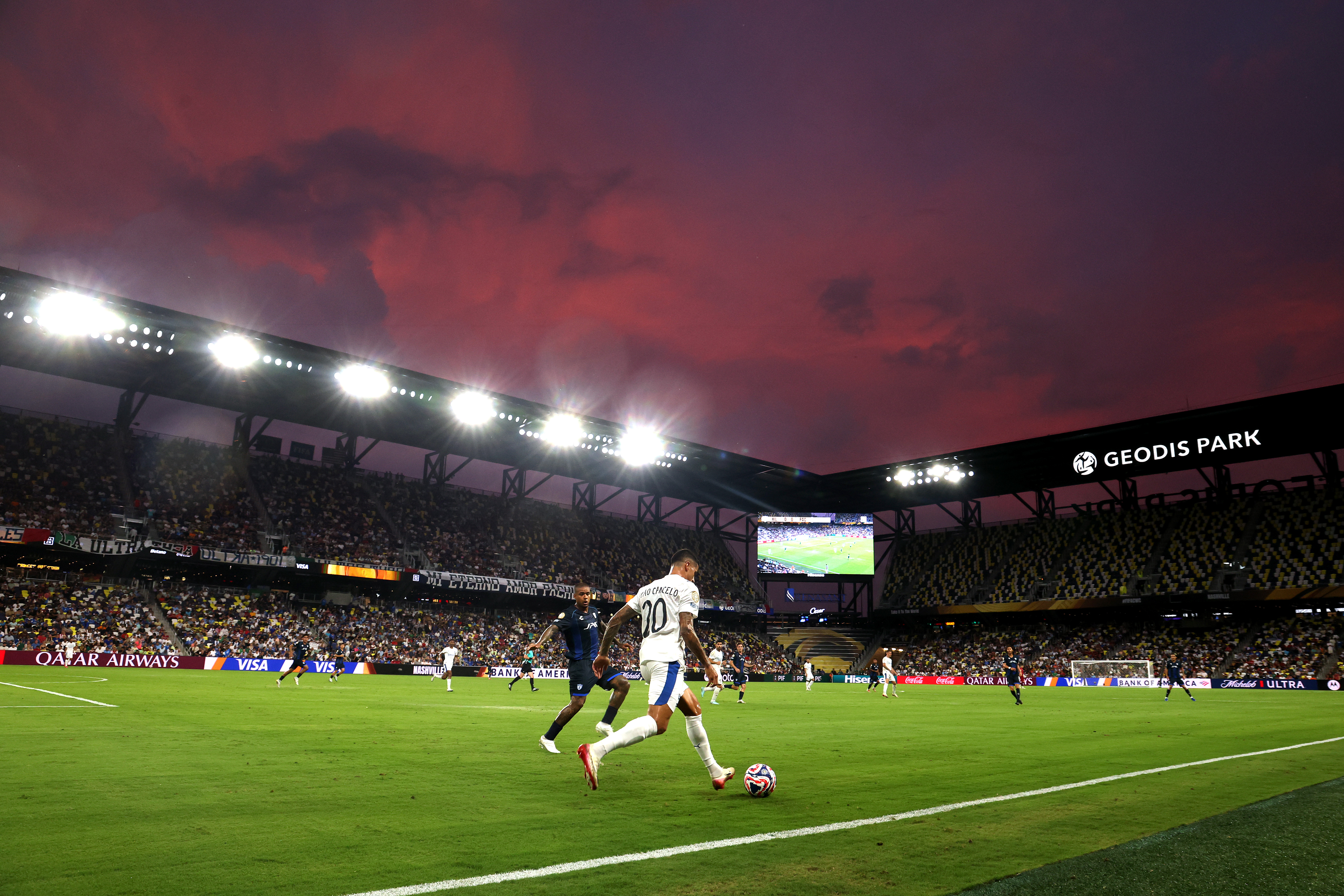 两场比赛同时开打。皇马与红牛的比赛在费城的大雨中展开,湿滑的草坪给皇马的进攻制造了困难,居莱尔的射门、吕迪格的头球、维尼修斯的单刀都未能转化为得分。