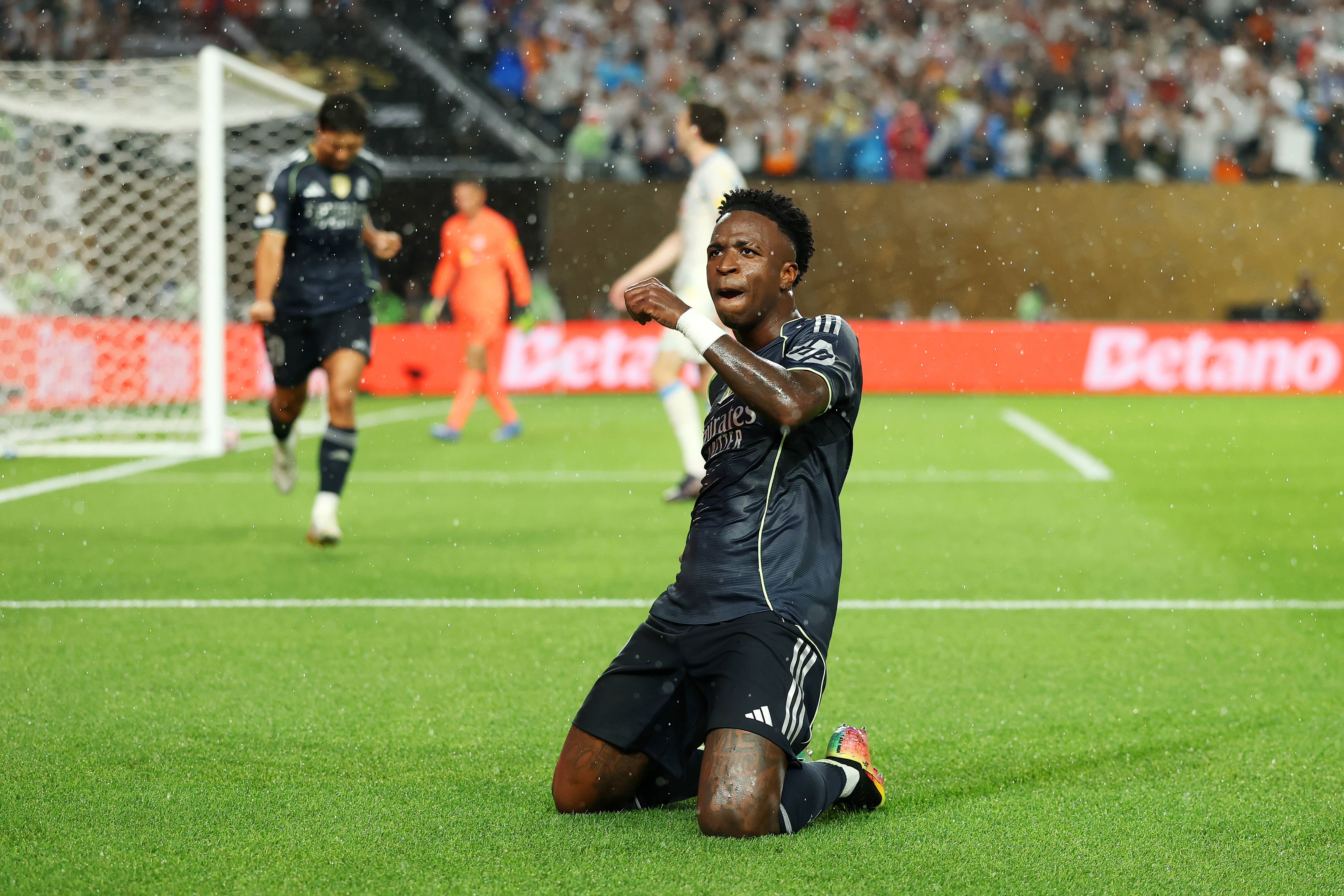 直至上半场快结束时,皇马才迎来进球。第40分钟,皇马打出快速反击,贝林厄姆后场送上直塞,维尼修斯带球突入禁区,晃过防守球员后劲射远角破门。