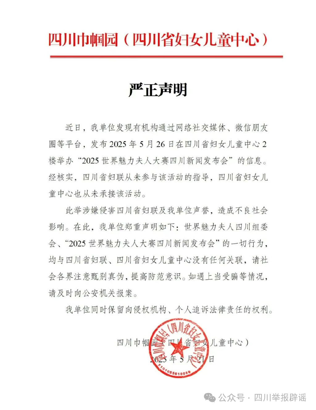 此举涉嫌侵害四川省妇联及我单位声誉,造成不良社会影响。在此,我单位郑重声明如下:世界魅力夫人四川组委会、“2025世界魅力夫人大赛四川新闻发布会”的一切行为,均与四川省妇联、四川省妇女儿童中心没有任何关联,请社会各界注意甄别真伪,提高防范意识。如遇上当受骗等情况请及时向公安机关报案。