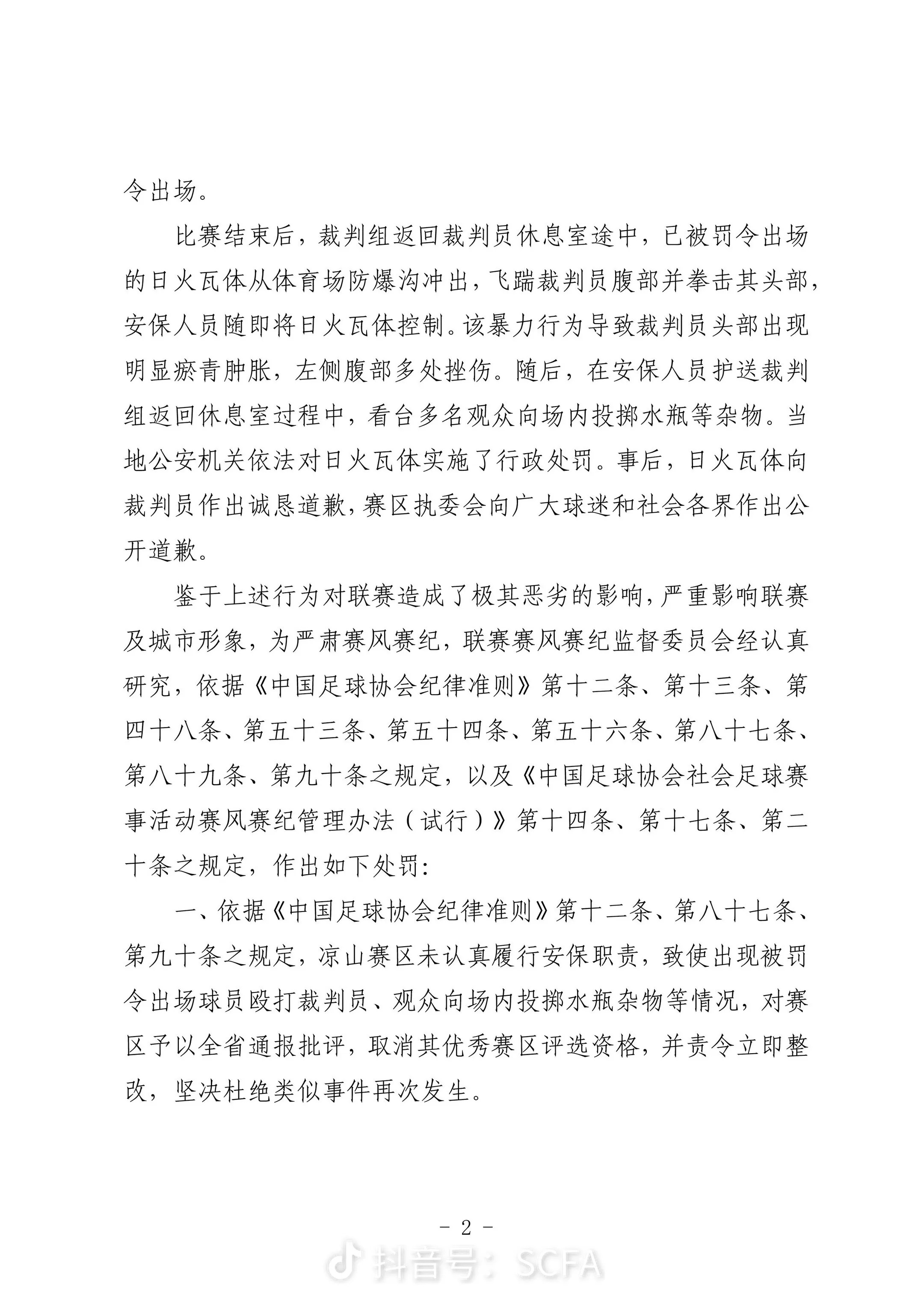 2026年1月5日晚,四川省足球协会发布了一则处罚决定,对此前“川超”联赛中对裁判实施暴力行为的凉山好医生队球员日火瓦体全省禁赛5年。