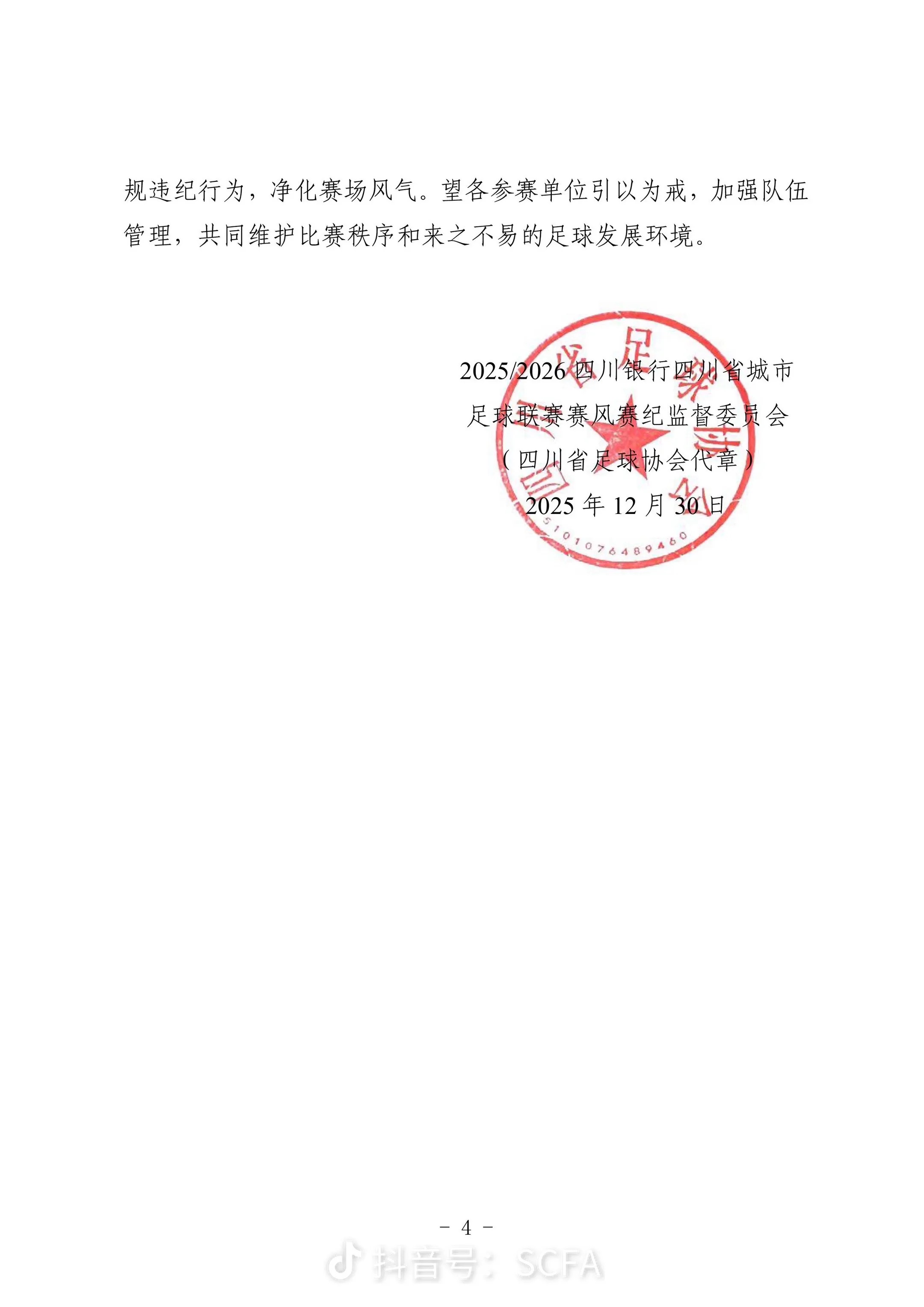 四川省足协公告称,结合公安机关对日火瓦体的行政处罚,决定禁止日火瓦体参加四川省各级体育部门及足协举办的足球赛事活动5年(2025年11月16日至2030年11月15日)。