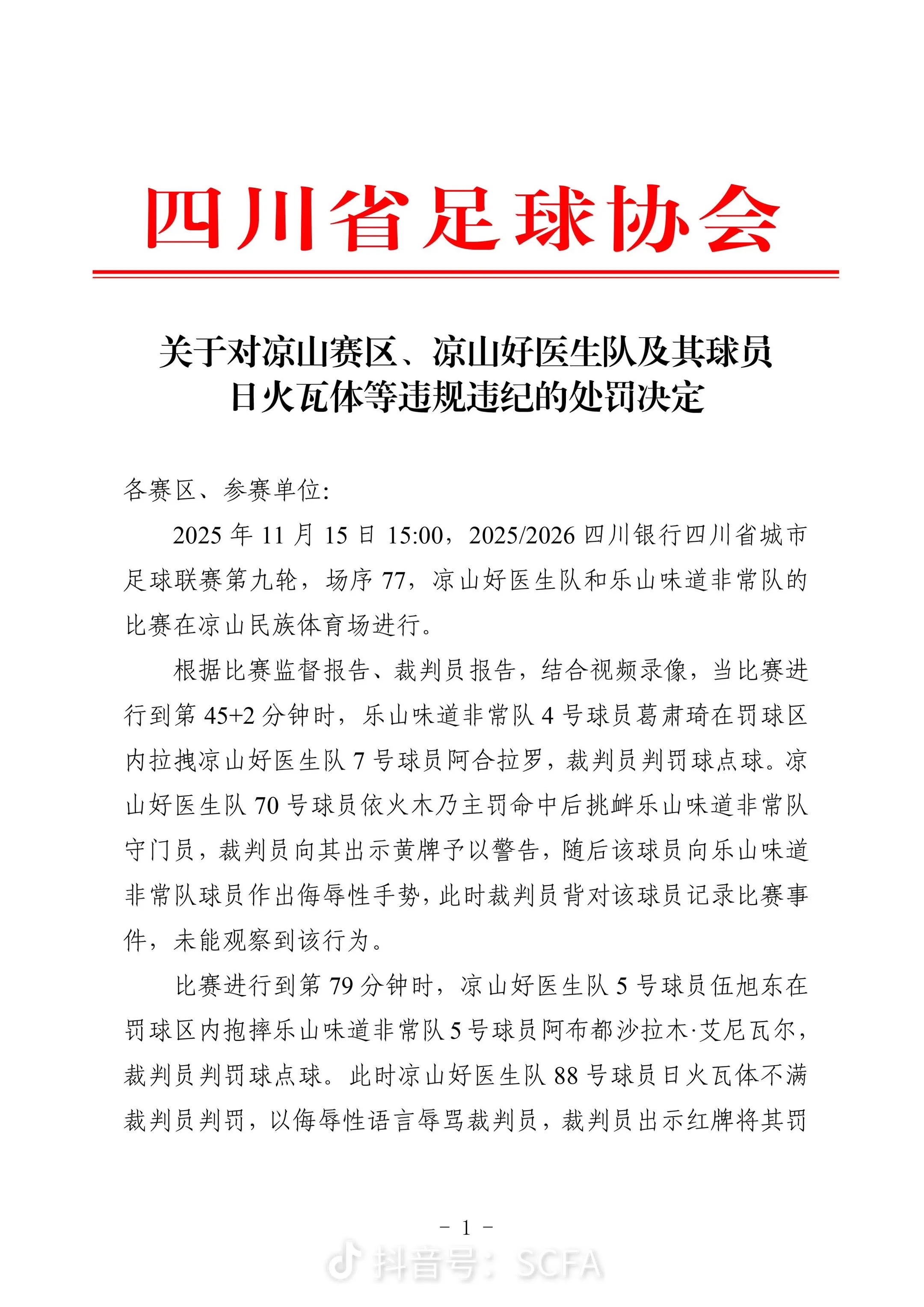 四川省足协在处罚决定中表示,2025年11月15日15:00,四川省城市足球联赛第九轮,凉山好医生队和乐山味道非常队的比赛在凉山民族体育场进行。