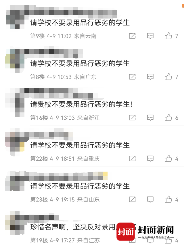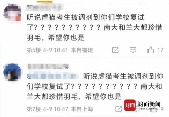 记者梳理网络信息发现,4月8日晚,有媒体报道称,徐某某并未进入兰州大学调剂拟录取名单。4月9日,有网友在社交平台称“虐猫考生调剂到西南科技大学”,为此,众多网友在西南科技大学官方微博内留言,请学校不要录取品行恶劣的学生,并提醒该校“珍惜名声”“珍惜羽毛”。