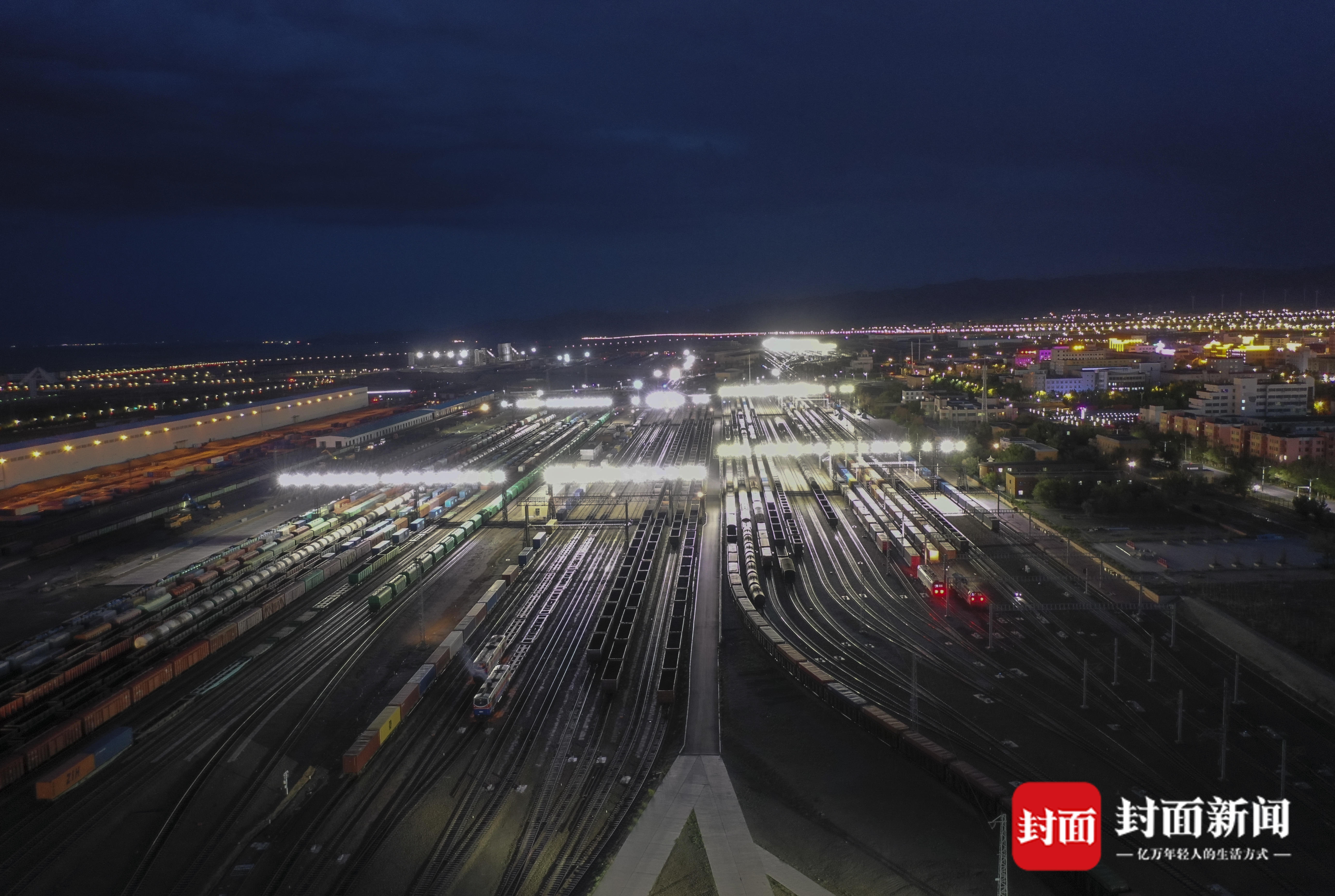 2023年7月7日夜,阿拉山口站编组场停靠着待发的中欧班列及其他出入境货物列车。