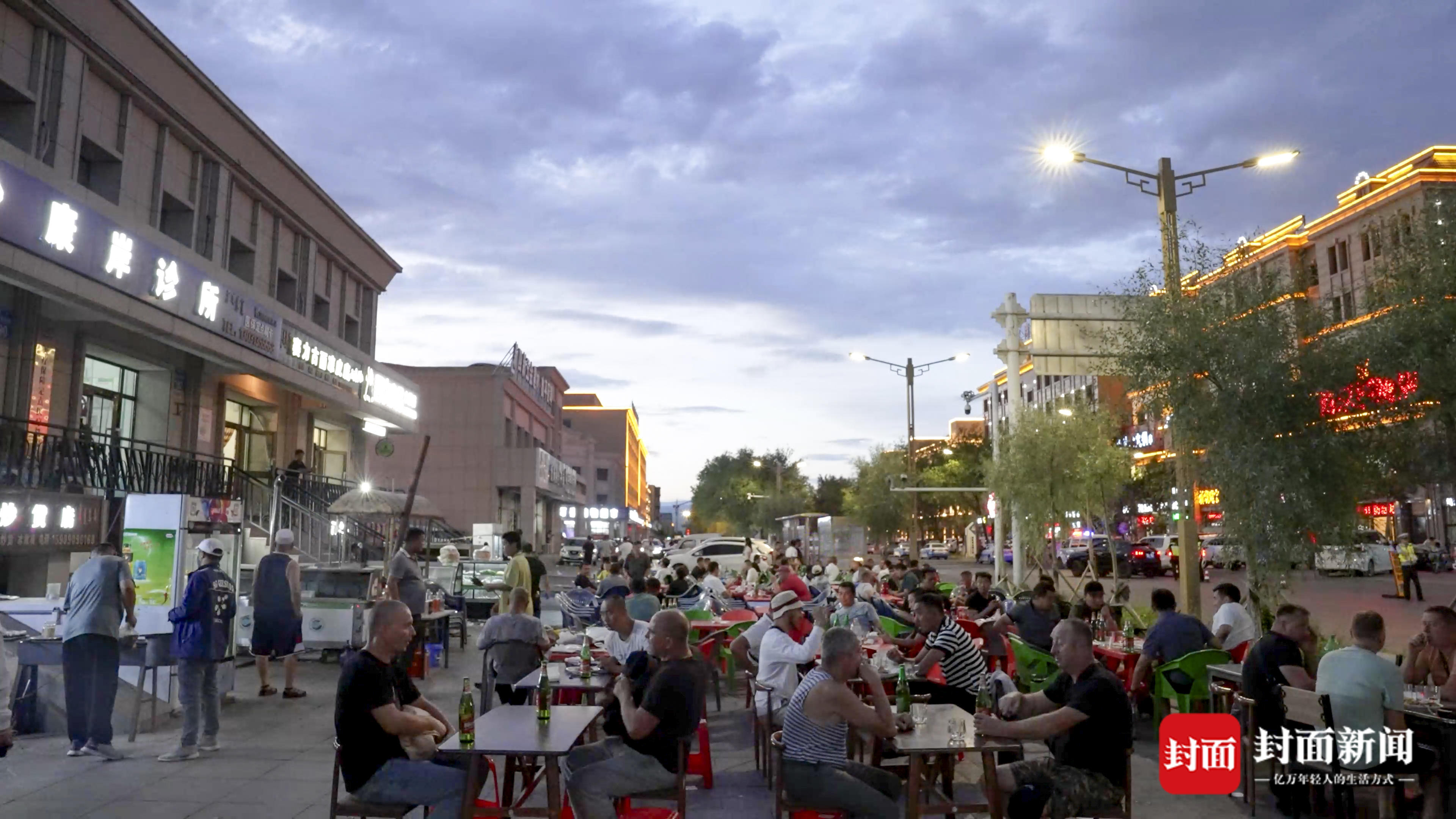 傍晚十一时,阿拉山口街边依旧人头攒动,距离酒店不到一公里的地方就是一条小吃街,来自哈萨克斯坦和白俄罗斯的大卡车司机和本地人一样,点上几瓶乌苏啤酒和羊肉串,悠闲地坐着开始享受山口的夜生活。