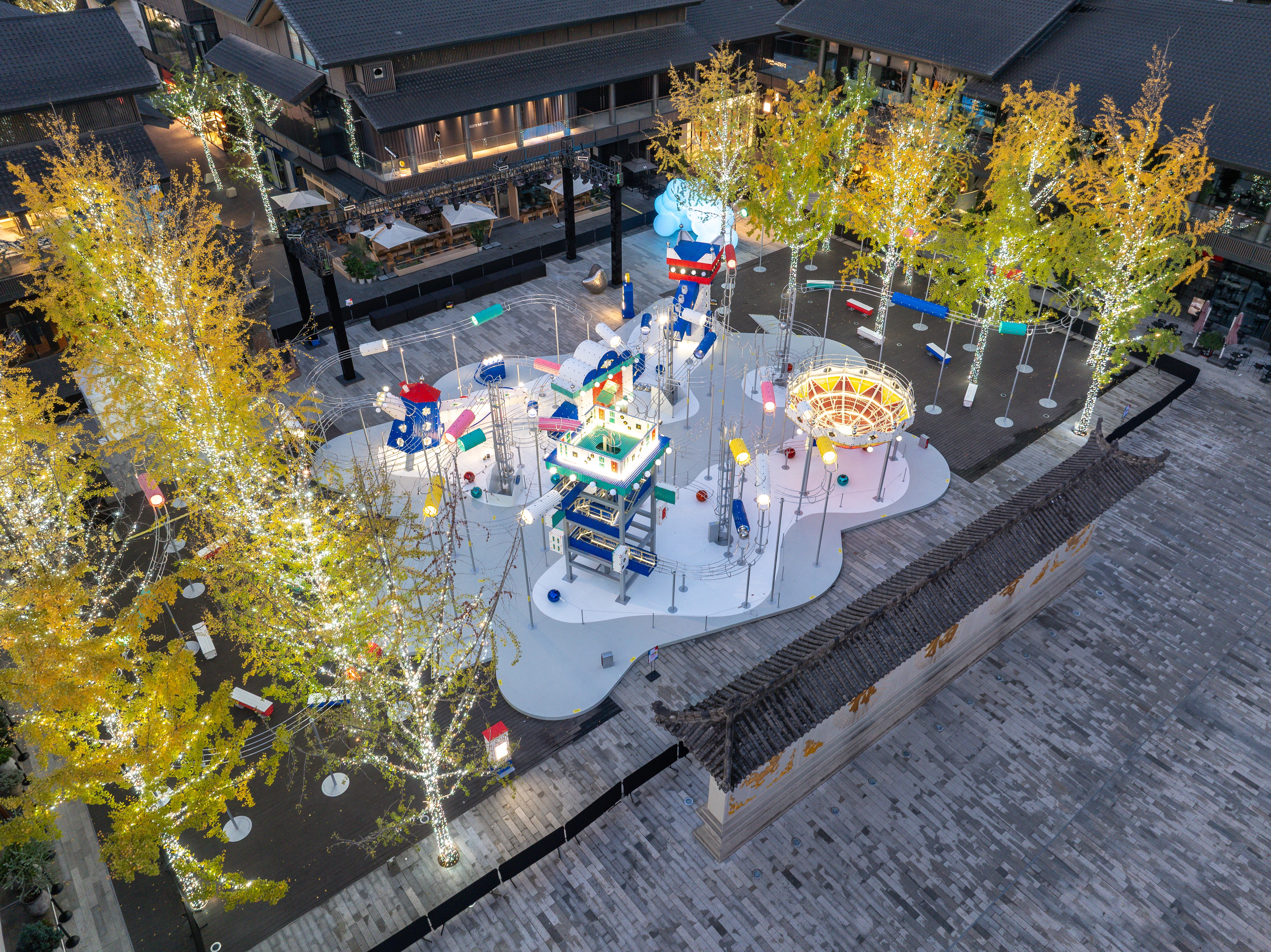 人生如旅,奇妙与欢乐就藏在每一个日常。此次,成都太古里特邀建筑师李涵,汲取在地建筑、文化及生活方式符号,原创“火锅楼”、“茶壶楼”、“麻将楼”、“川剧戏台”和“碉楼跳台”五座建筑,生动再现五个成都城市生活场景,蜿蜒的大型轨道和动力球穿梭其间,更增添动力与流动感。步入装置内,可在互动区转动手柄释放动力球,小球顺势滚动,或快或慢,仿佛串联起人们日常生活的小确幸。当夜幕降临,缤纷的灯光点亮了整个装置,童趣十足的斑斓彩灯随之流转,欢乐的情绪也随小球持续滚动而不断蔓延,产生更多的“快乐势能”。同期,于马家巷禅院外也特别打造了一颗大熊猫钟爱的“竹笋”,翠芽挺拔,环绕竹笋的小球不断转动,转出新一年的节节好运。