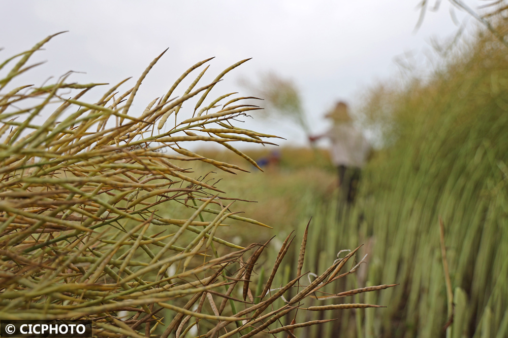 ↑2025年5月10日,安徽省安庆市宿松县复兴镇复兴社区农民在收割油菜。CICPHOTO/李龙 摄