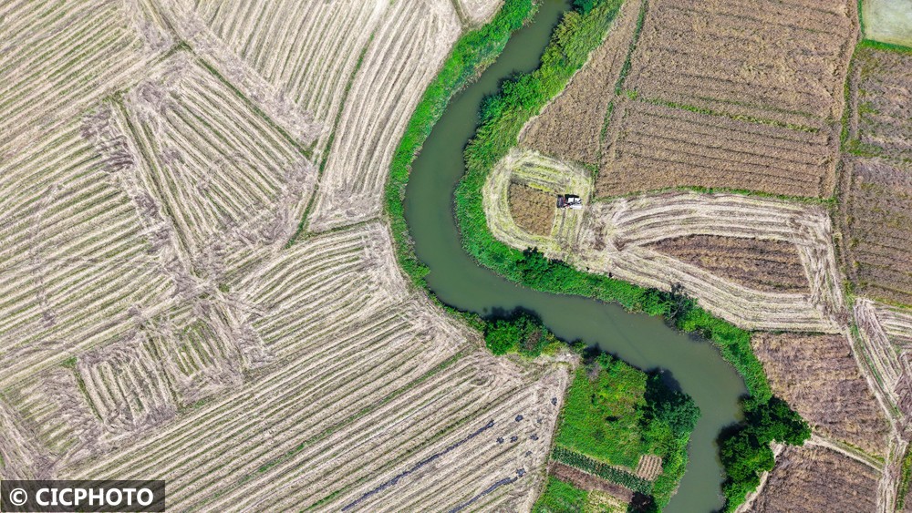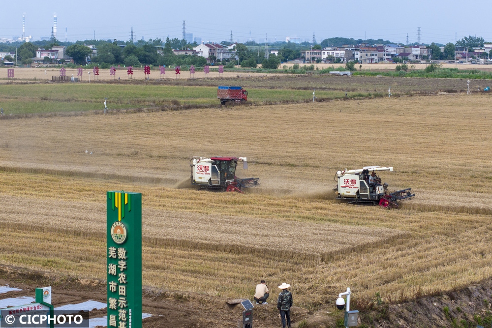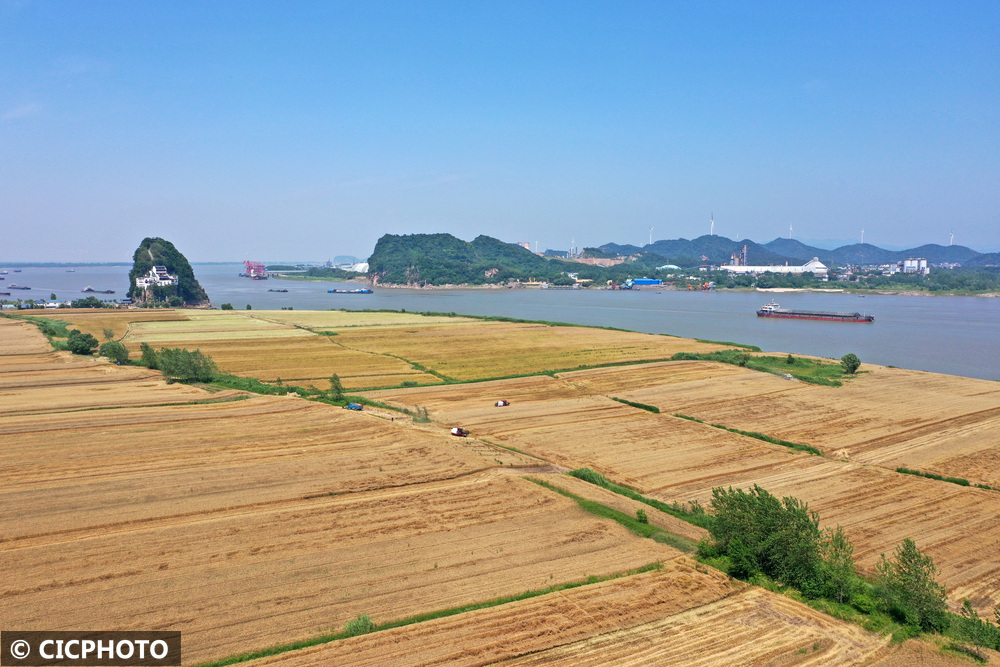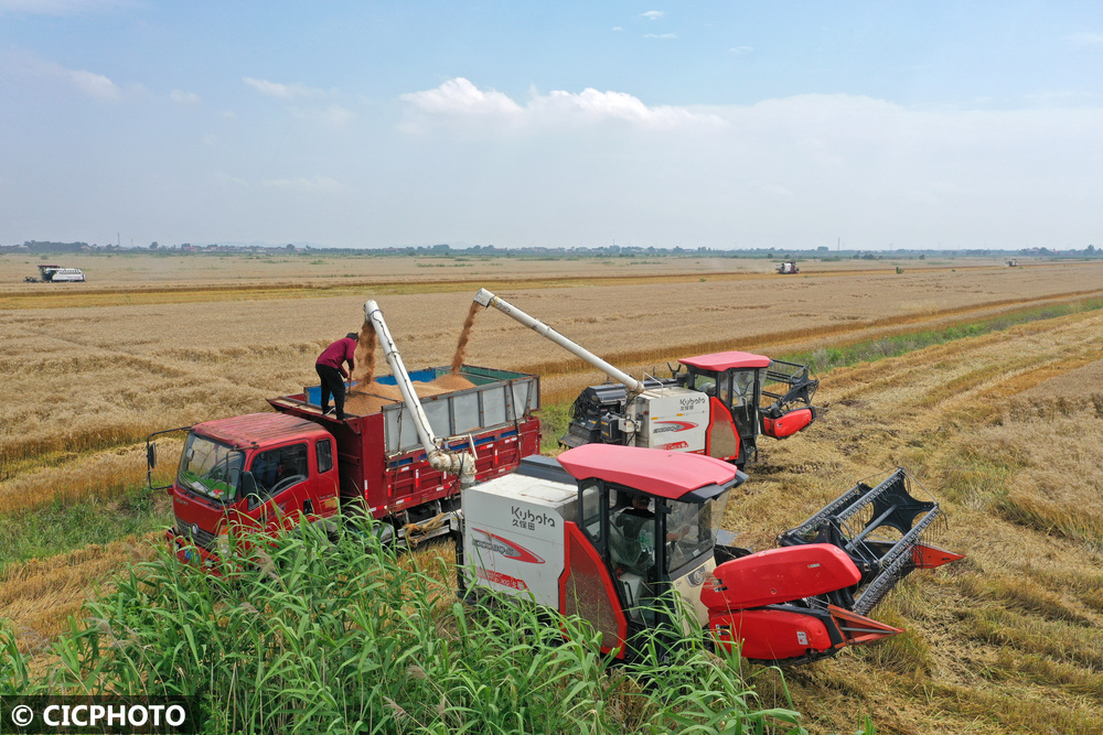 ↑2025年5月17日,在位于安徽省安庆市宿松县的安徽农垦集团华阳河农场第六农业分场,农机手将收割的小麦装车。(无人机照片)CICPHOTO/李龙 摄