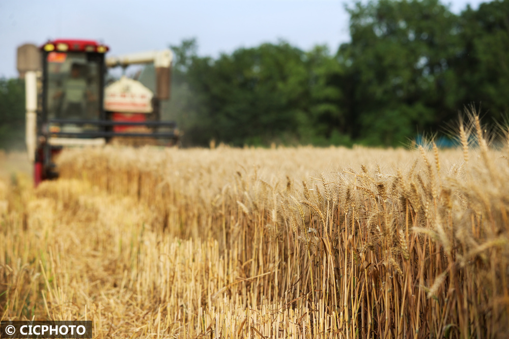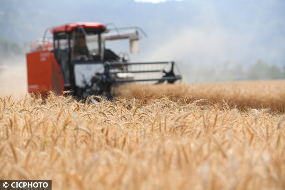↑2025年5月18日,四川省阆中市洪山镇多宝村农民驾驶农机收割小麦。CICPHOTO/王玉贵 摄