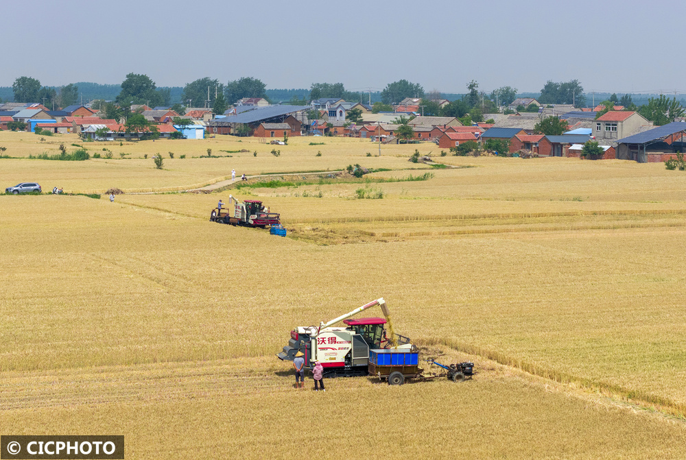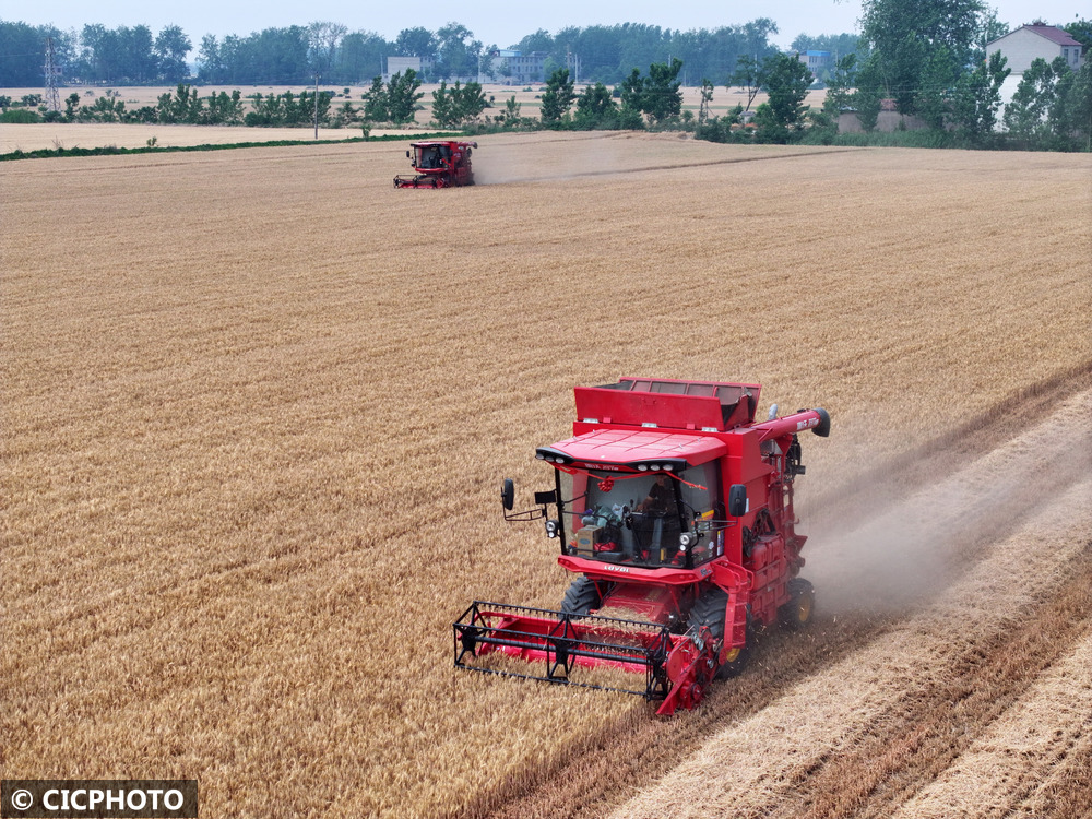 ↑2025年5月20日,江苏省宿迁市泗洪县龙集镇应山村农民驾驶农机收割小麦。(无人机照片)CICPHOTO/张连华 摄