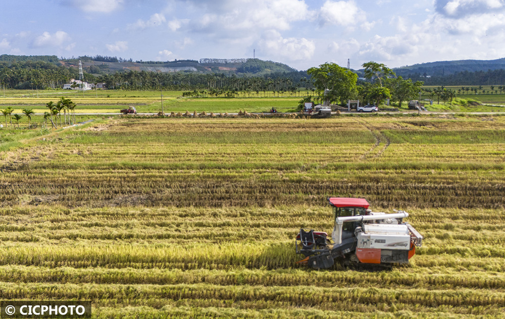 ↑2025年5月20日,海南省琼海市博鳌镇北岸村农民驾驶农机收割早稻。(无人机照片)CICPHOTO/蒙钟德 摄