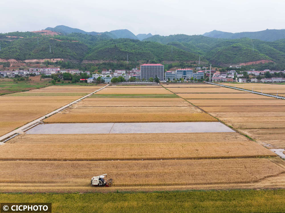 ↑2025年5月15日,湖北省襄阳市保康县马桥镇中坪村农民驾驶农机收割小麦。(无人机照片)CICPHOTO/杨韬 摄