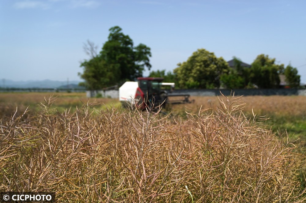 ↑2025年5月19日,浙江省湖州市安吉县递铺街道鹤鹿溪村农民驾驶农机收割油菜。CICPHOTO/潘学康 摄