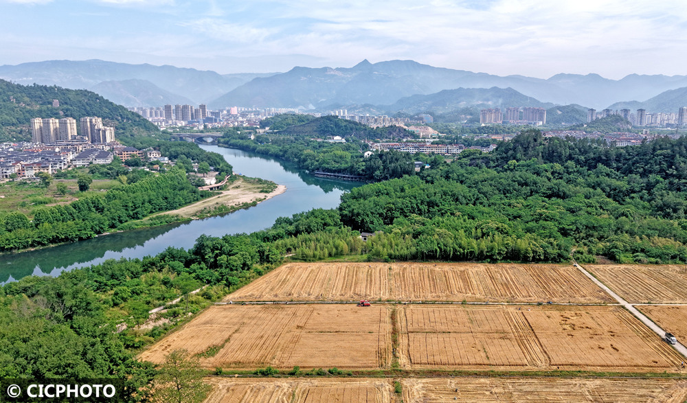 ↑2025年5月15日,浙江省台州市仙居县南峰街道城南村农民驾驶农机收割小麦。(无人机照片)CICPHOTO/王华斌 摄