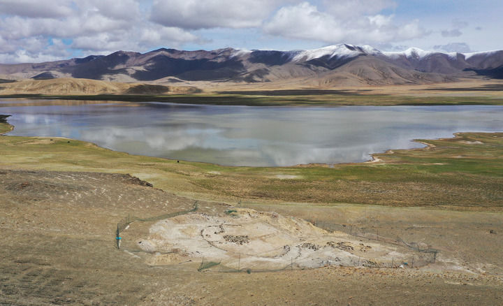 这是2025年5月22日拍摄的坐落在玛不错湖畔的遗址第四期石构地面建筑考古发掘现场(无人机照片)。新华社记者 李贺 摄