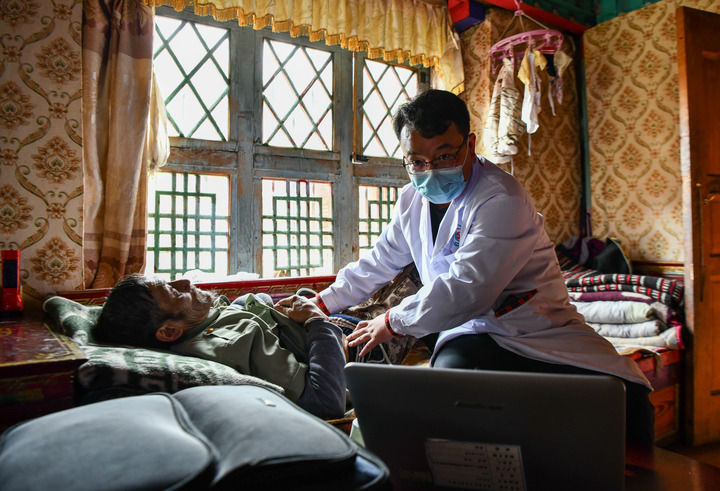 2023年6月12日,广东珠海市人民医院第七批援藏医疗队王旭彤医生在给西藏米林市吞不绒村患者珠杰检查身体。新华社记者 晋美多吉 摄