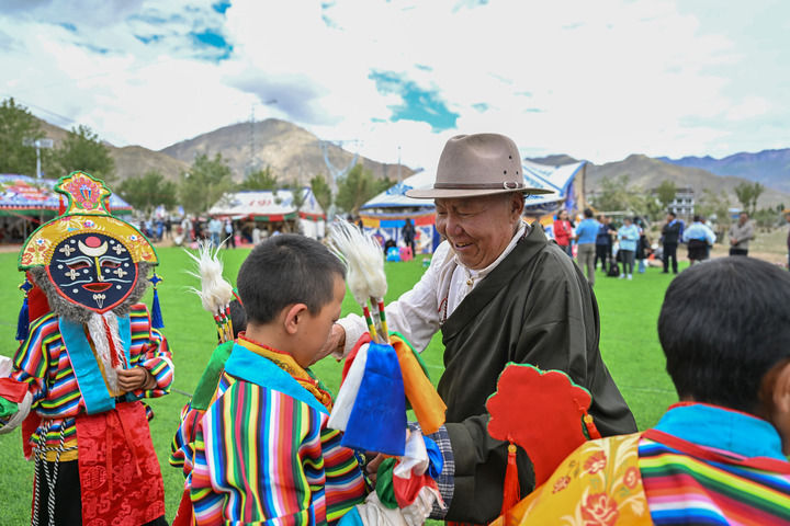 2025年7月16日,76岁的湘巴藏戏国家级非遗传承人次仁多吉(右二)在西藏南木林县非遗公园内给即将表演湘巴藏戏的小演员整理服装。新华社记者 李鑫 摄