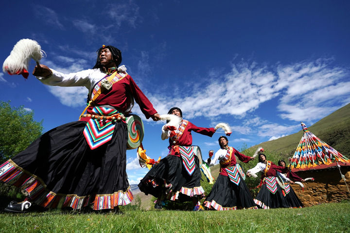 2020年7月1日,在西藏山南市琼结县,久河村卓舞队的队员在表演国家级非遗项目“久河卓舞”。新华社记者 詹彦 摄