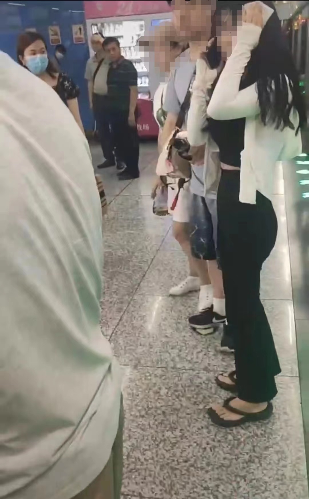 女孩用手捂住流血的头部,与中年妇女母子两人在地铁站厅里。截屏图