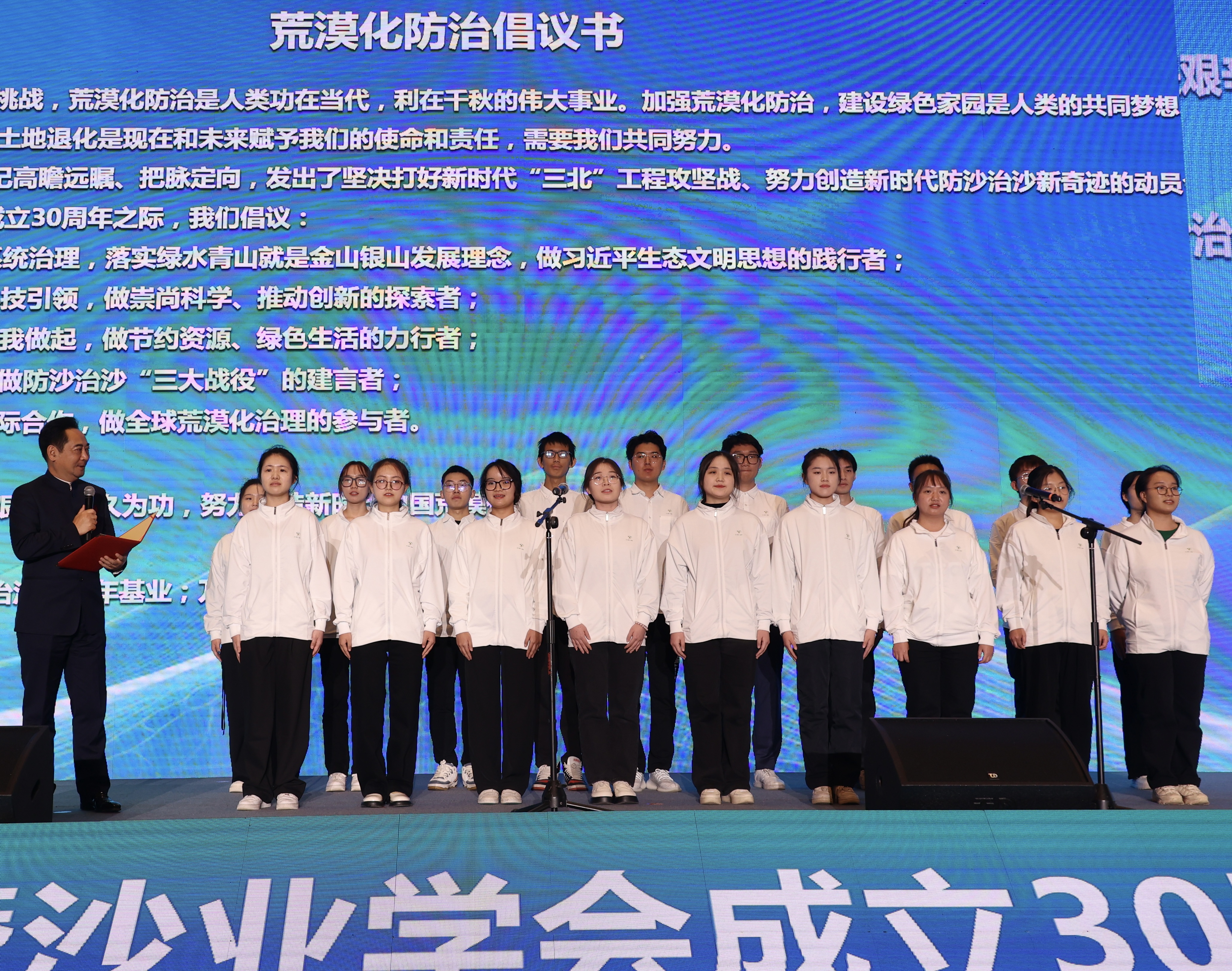 △中国治沙暨沙业学会形象大使刘劲带领北京林业大学学子发布“荒漠化防治倡议”。主办方供图